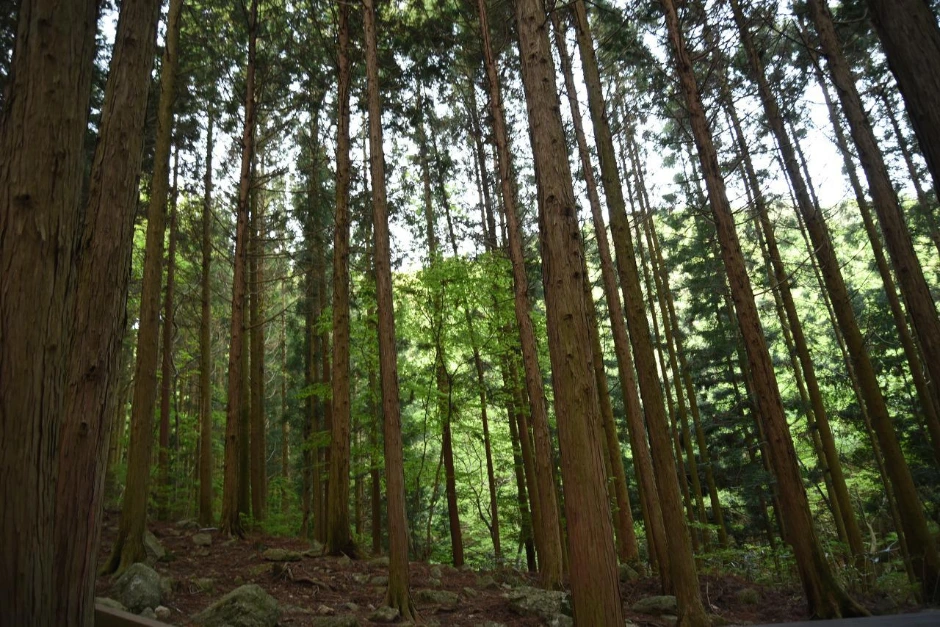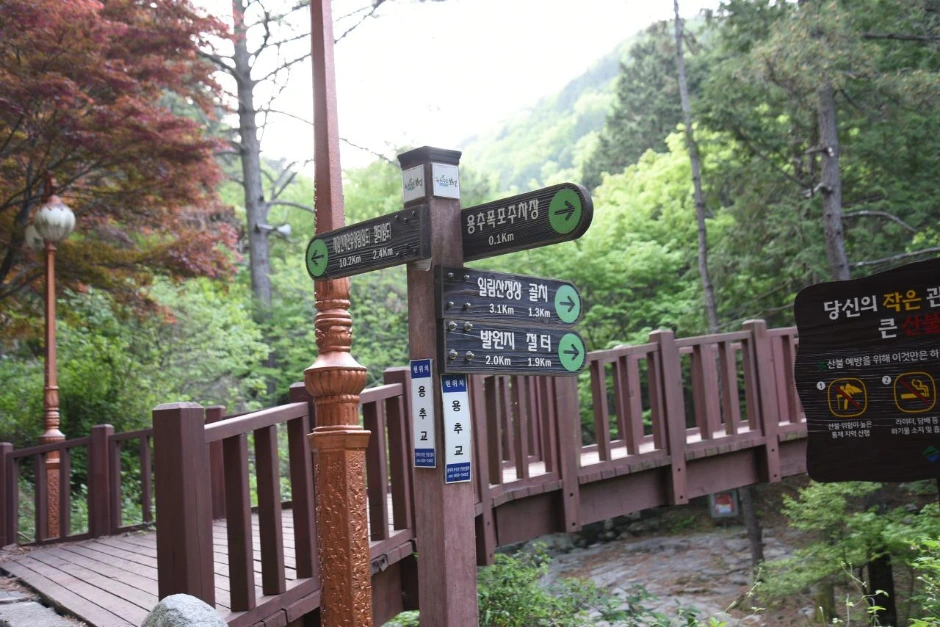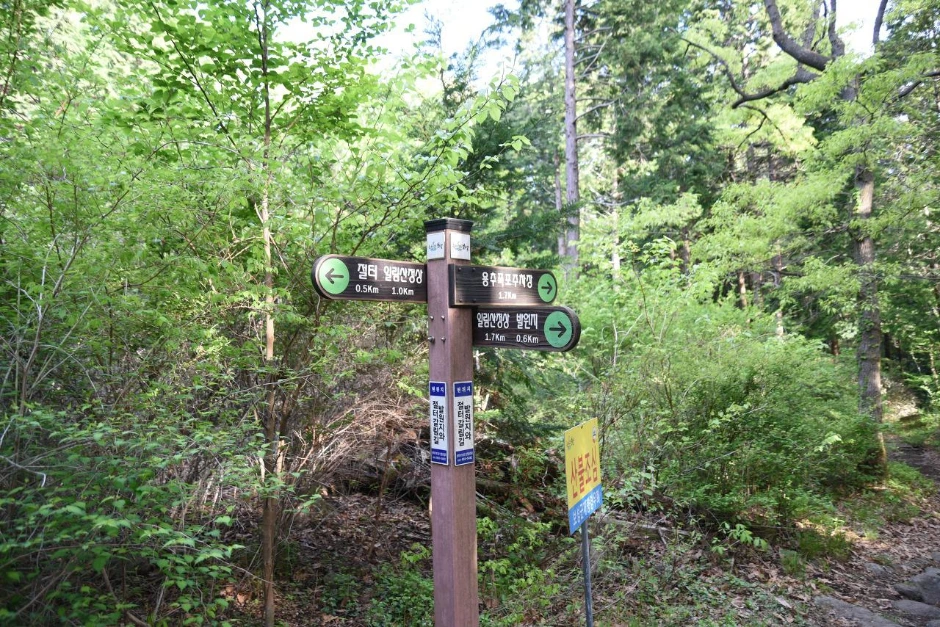 용추교를 건너면 편백 숲과 먼저 만난다. 키가 큰 편백나무의 줄기와 잎이 만들어 내는 짙은 숲 색은 건강하게 만들어 주는 묘약의 느낌이다. 편백 숲에서는 그냥 가만히 앉아 있기만 해도 피톤치드 덕분에 건강해질 것 같다.