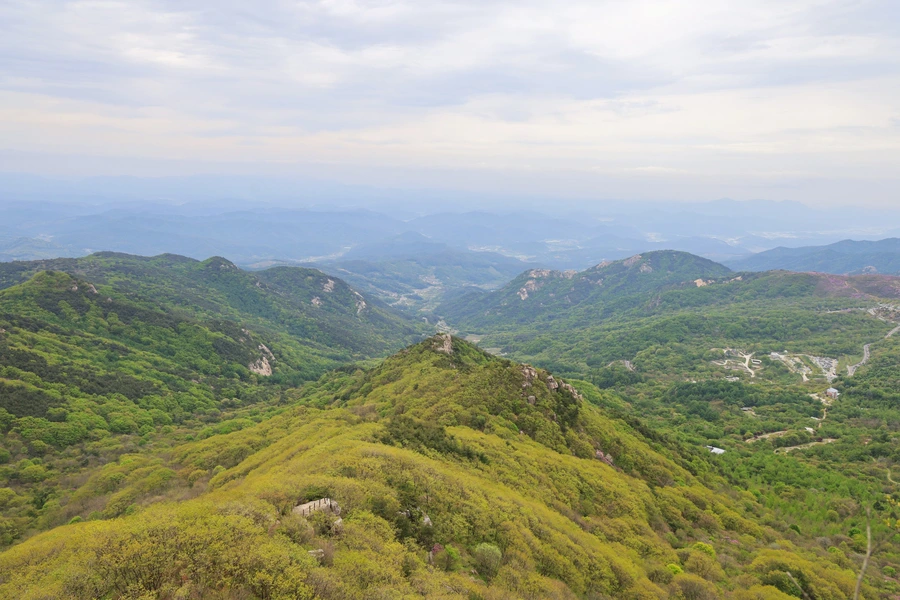 산의 오른쪽은 연두, 왼쪽은 연분홍. 등산로 계단이 갈라놓은 건 아닐 텐데 참으로 자연의 조화 속이다.