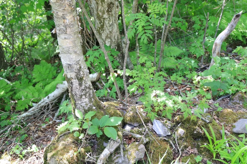 드러난 뿌리 사이에 여러 가지 식물들이 공생하고 있다. 원 나무는 사스레나무로 보이는데, 단풍나무를 비롯하여 각기 다른 잎모양이 여럿이다.