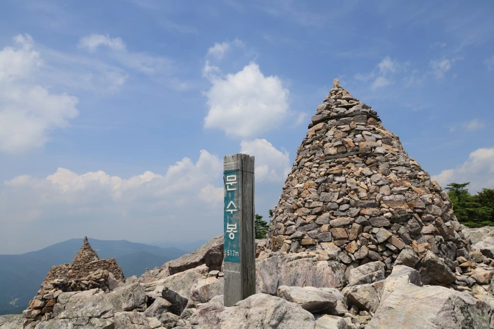 문수봉에 도착했다. 커다란 바위들이 가득한 너덜지대다. 문수봉은 특이하게 표지목(나무)인데, 해발 1517m이니까 여기도 천고지가 넘는다.