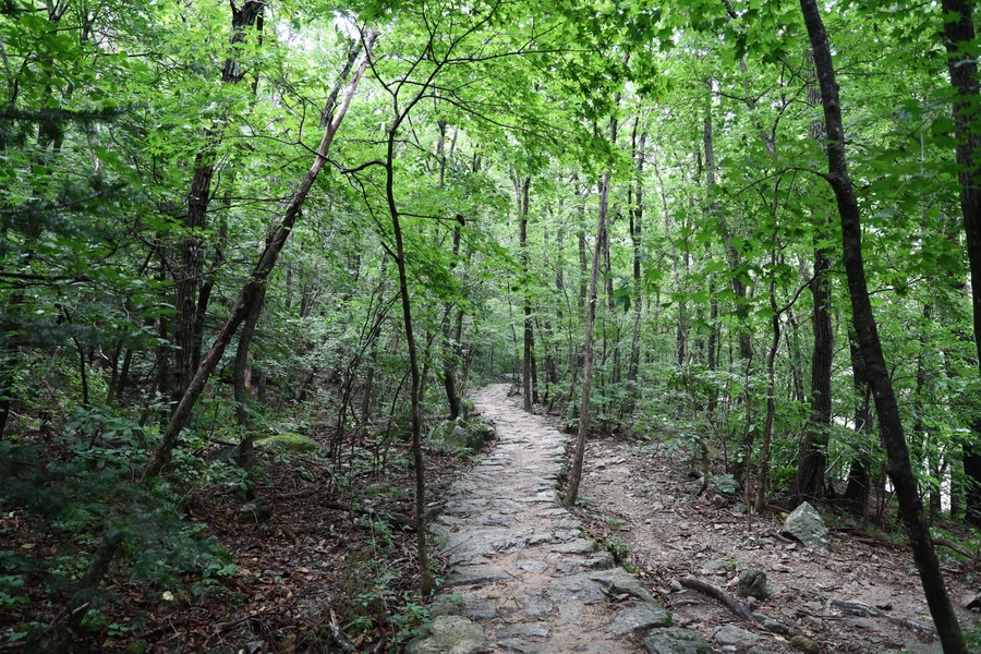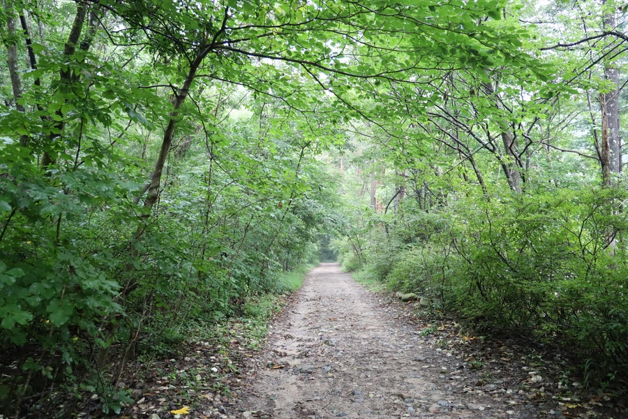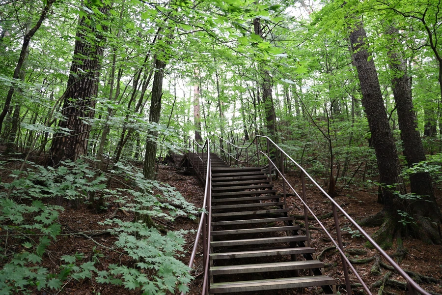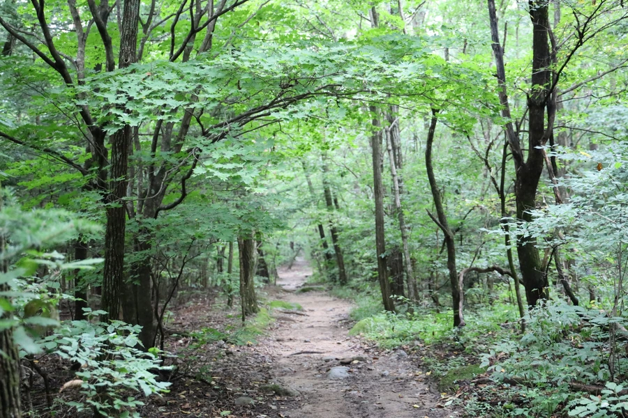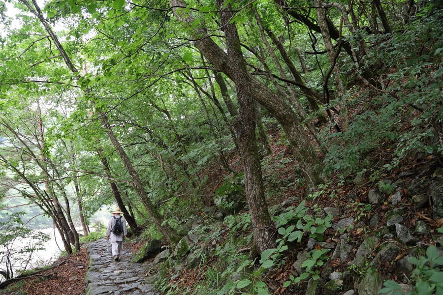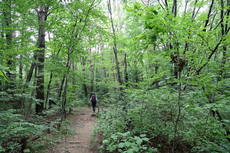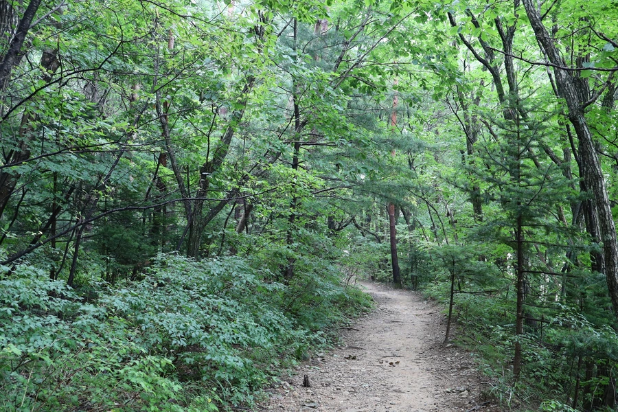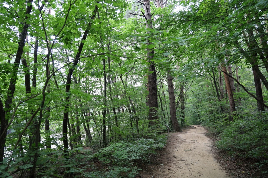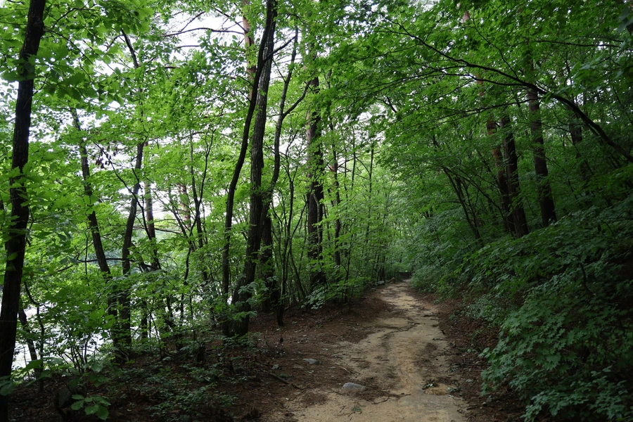 길은 대체로 평길 수준이다. 여름 숲은 녹색이다. 보는 눈도 즐겁지만, 좋은 공기와 피톤치드의 영향권에 들어가는 건강한 경험을 하는 중이다.