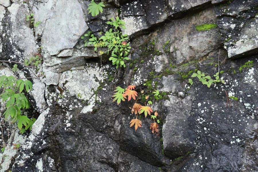 바위 틈에 자라는 식물들. 단풍이 든 바위취도 보인다.