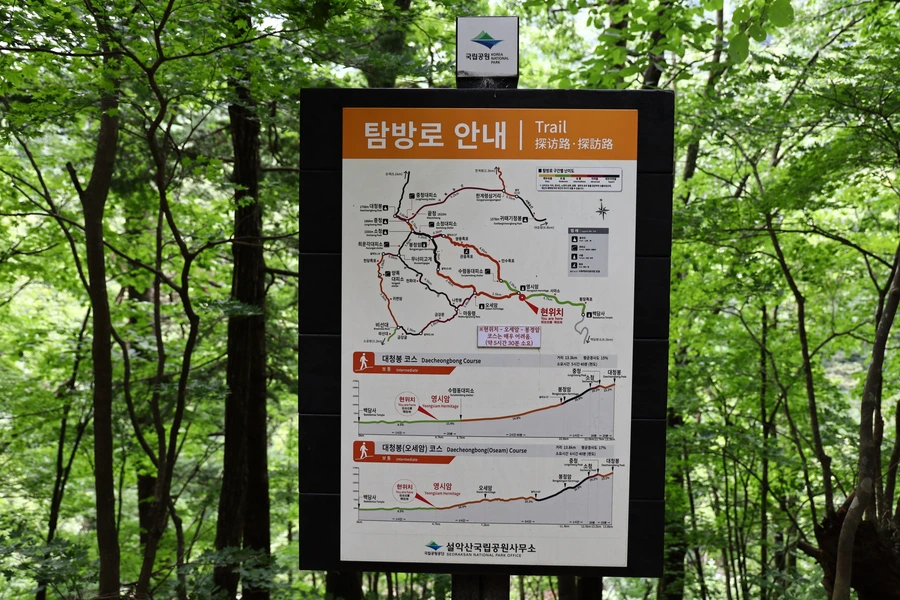 등산로 안내도를 보고 백담사에서 대청봉까지 계산해 보니까 편도 12.9km다. 왕복하면 거의 26km가 된다.