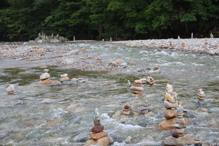 이곳 백담사 근처의 개천에는 자갈로 돌탑을 쌓아놓은 것이 특징이다. 규모가 작아진 것을 보니까 이번 비에 많이 휩쓸린 모양이다.