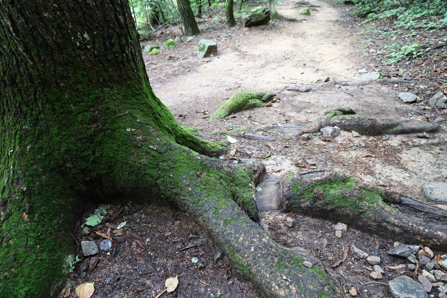 등산로 가운데 버티고 있는 전나무를 보니 딱 신발 들어갈 만큼의 홈이 생겼다. 흙 위로 드러난 뿌리를 사람들이 얼마나 밟고 다녔으면 그런 흔적이 생겼을까 싶다.