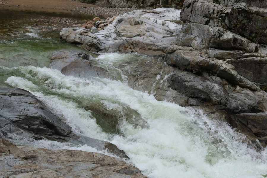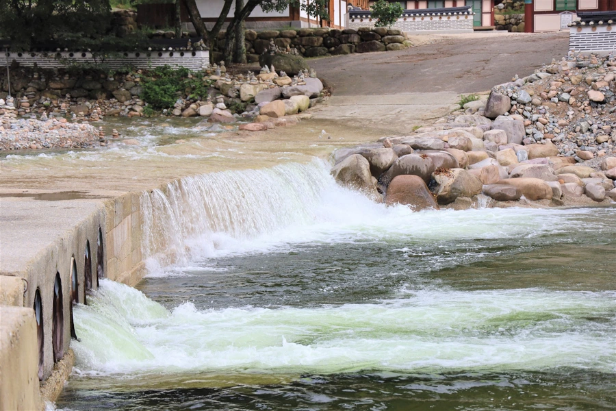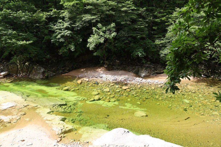 살짝 경사가 있는 바위 사이에 폭이 좁은 곳이 있어서 물살이 거세게 흐르고 있었다. 우렁찬 소리에 절로 시원해진다.