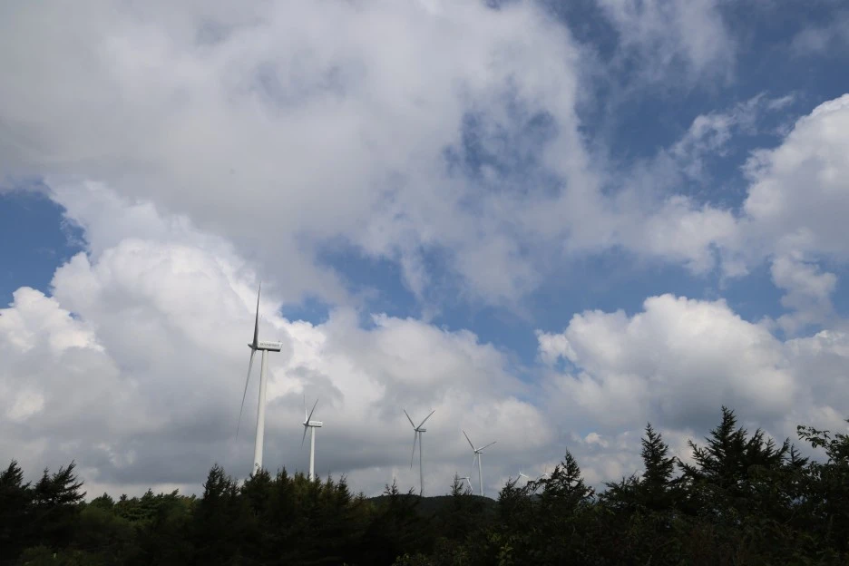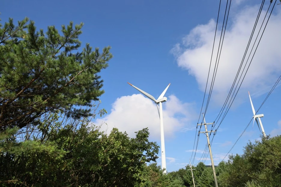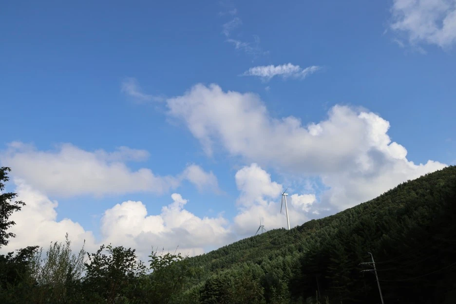 하늘과 구름이 풍력발전기와 잘 어울린다.