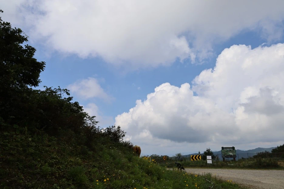 여름에 다시 찾은 태기산은 풍경만 녹색으로 바뀌었을 뿐 풍력발전기의 모습, 지잉 지잉 소리, 파란 하늘에 흰구름까지 또 보니 반가웠다.