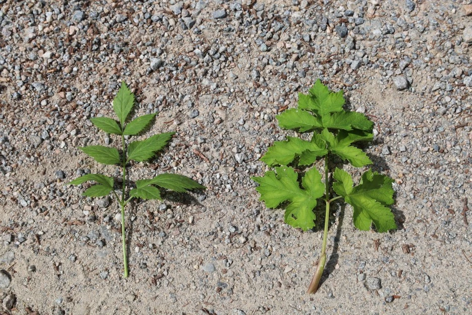 잎도 비교해 보았다. 왼쪽이 궁궁이, 오른쪽이 어수리다. 잎의 크기는 궁궁이가 더 클 때도 있으니까 비교할 수 없지만, 잎모양은 확실히 달랐다. 어수리 잎이 좀 더 두꺼운 느낌이었다.