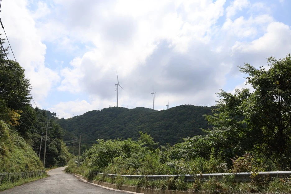 태기산 길에는 도로를 따라 풍력발전기가 쭈욱 세워져 있다. 겨울에 갔을 때 하얀 눈길과, 풍력발전기와, 이마를 때리던 찬 바람, 지잉 지잉 울리던 풍력발전기 소리가 기억난다. 파란 하늘에 흰 구름도 참 인상적이었다.