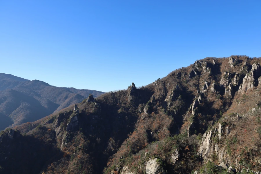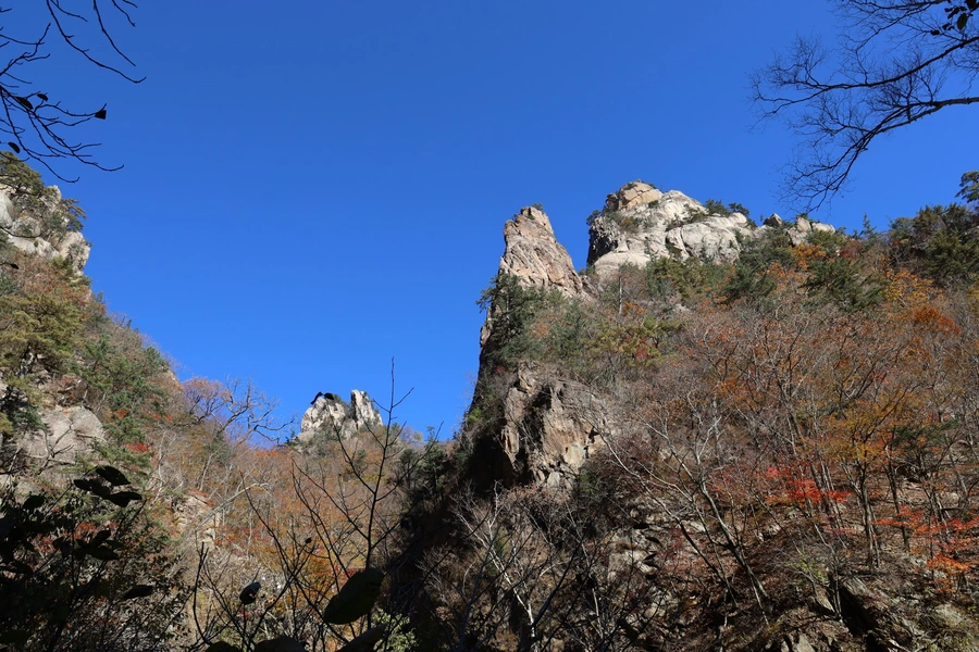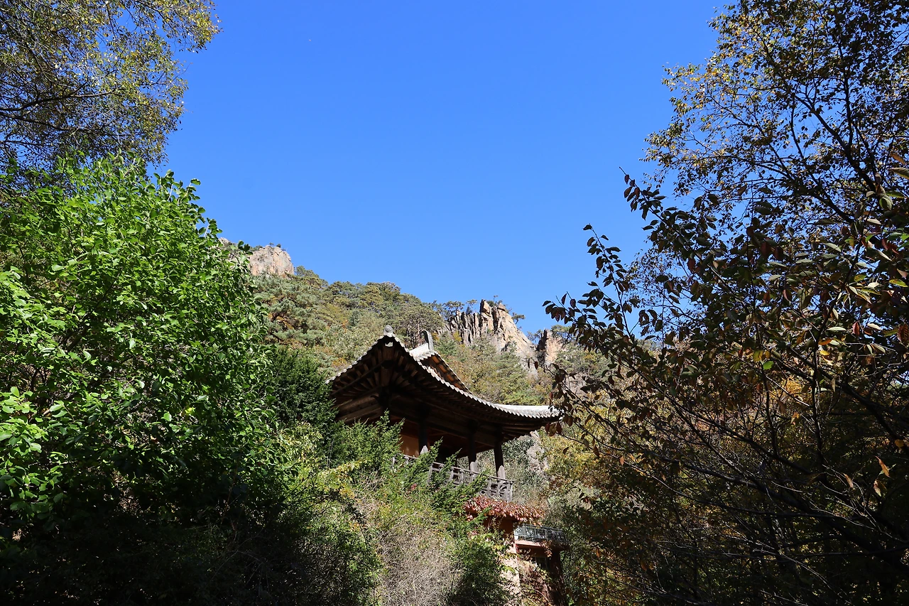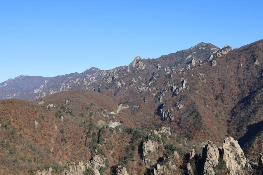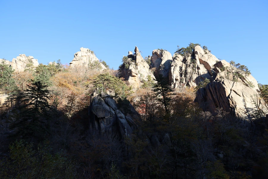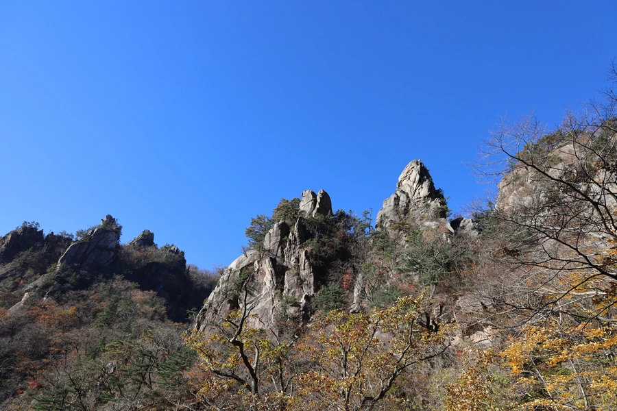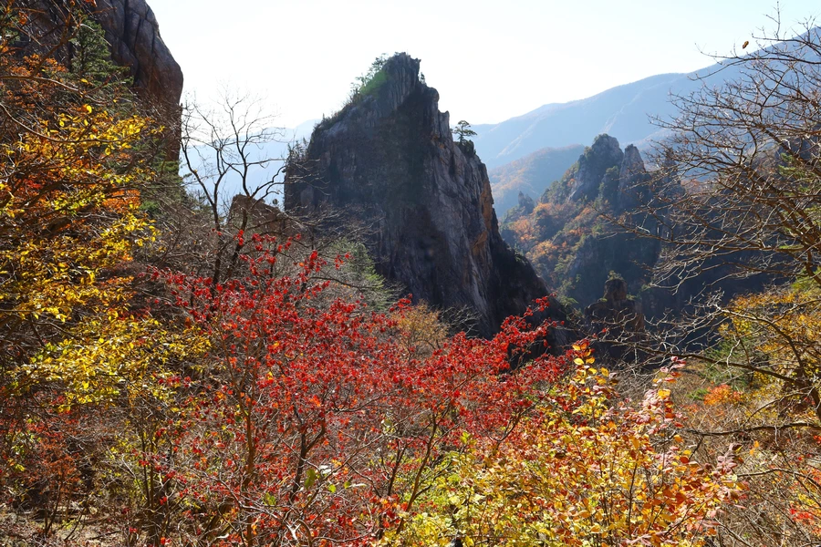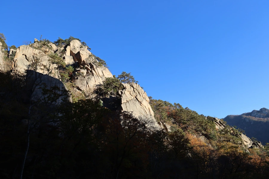 고도가 낮아지면서 단풍색이 보이기 시작한다. 기암괴석과 어울리는, 금강산 못지않은 풍광이 우리 앞에 펼쳐지기 시작한다.