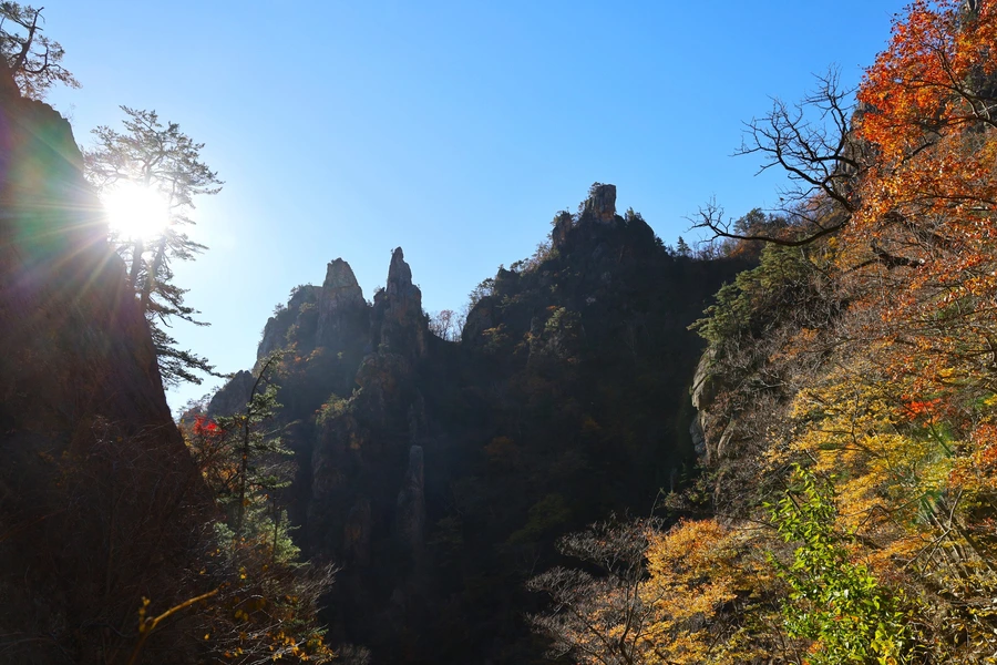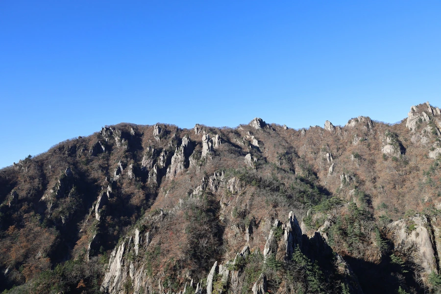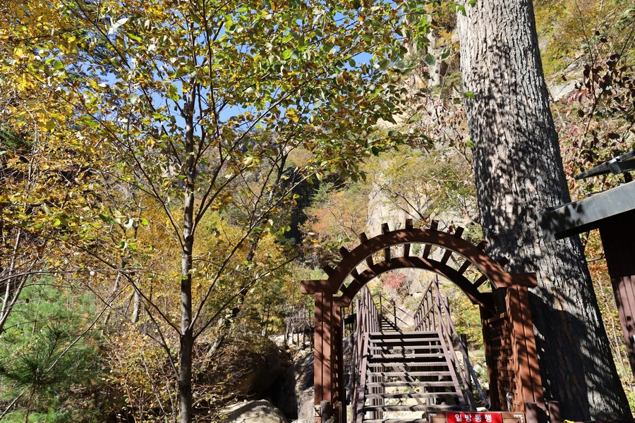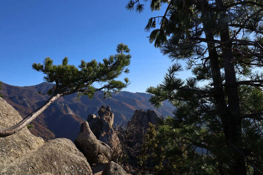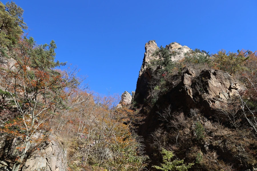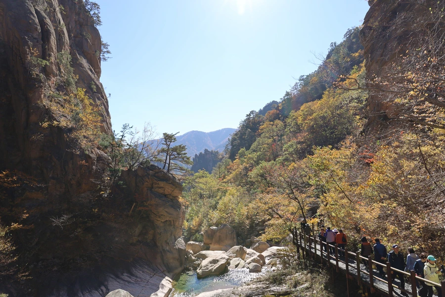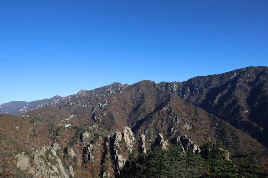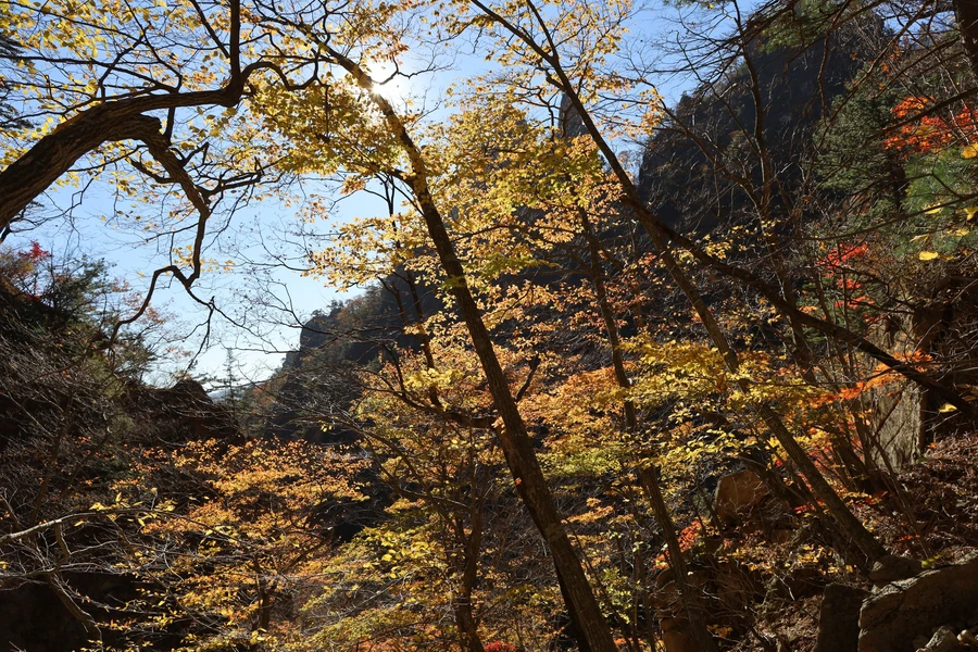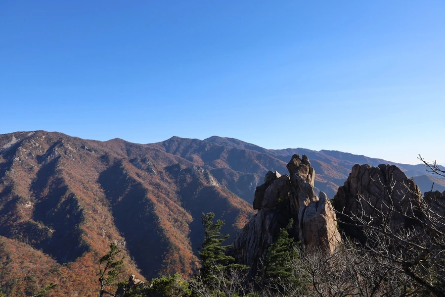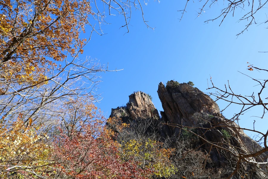 고도가 낮아지면서 단풍색이 보이기 시작한다. 기암괴석과 어울리는, 금강산 못지않은 풍광이 우리 앞에 펼쳐지기 시작한다.