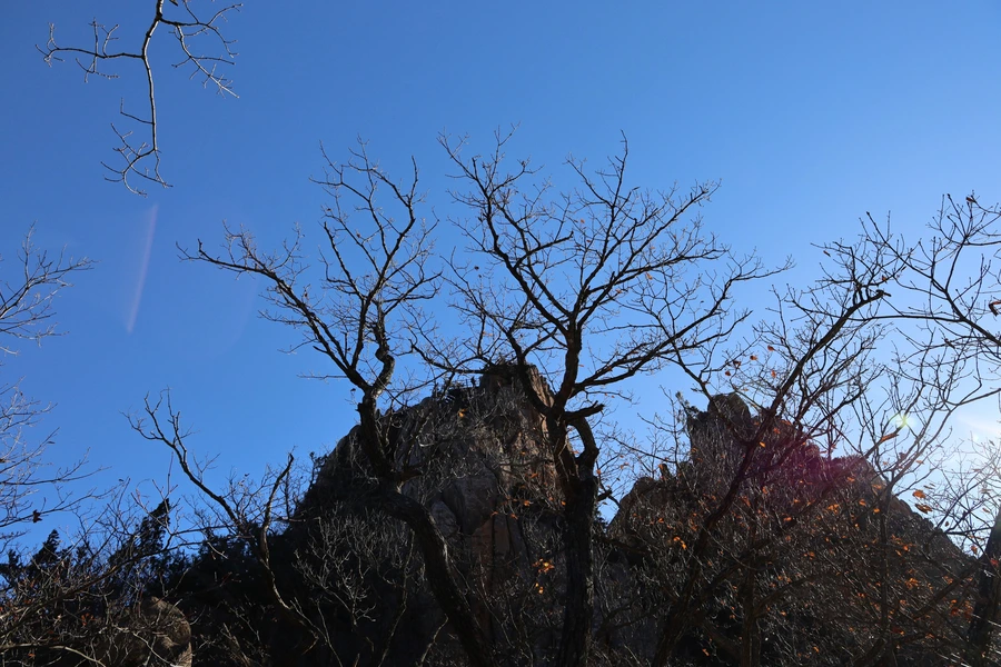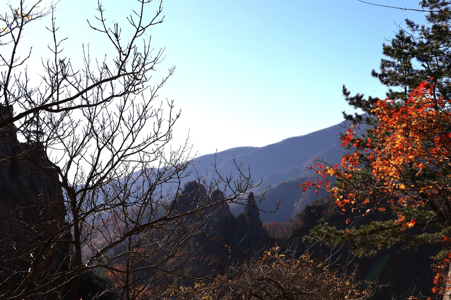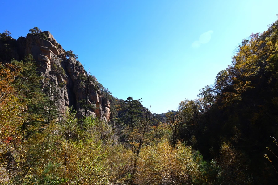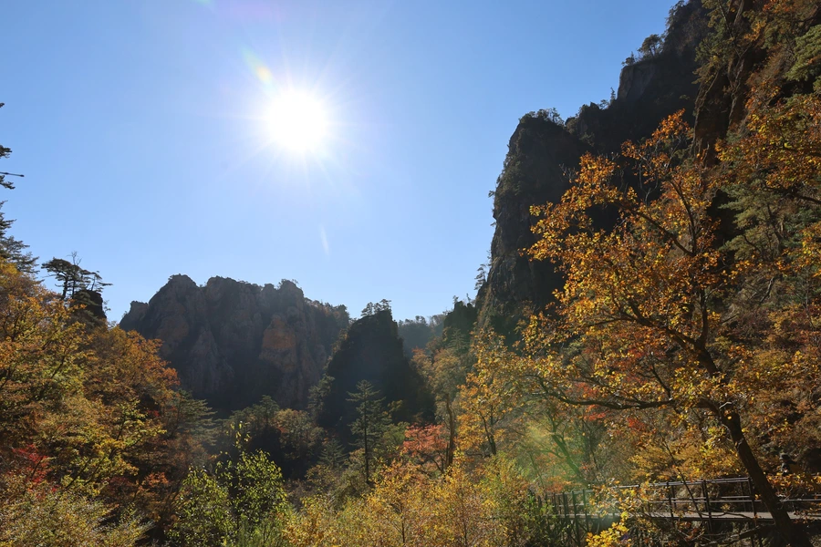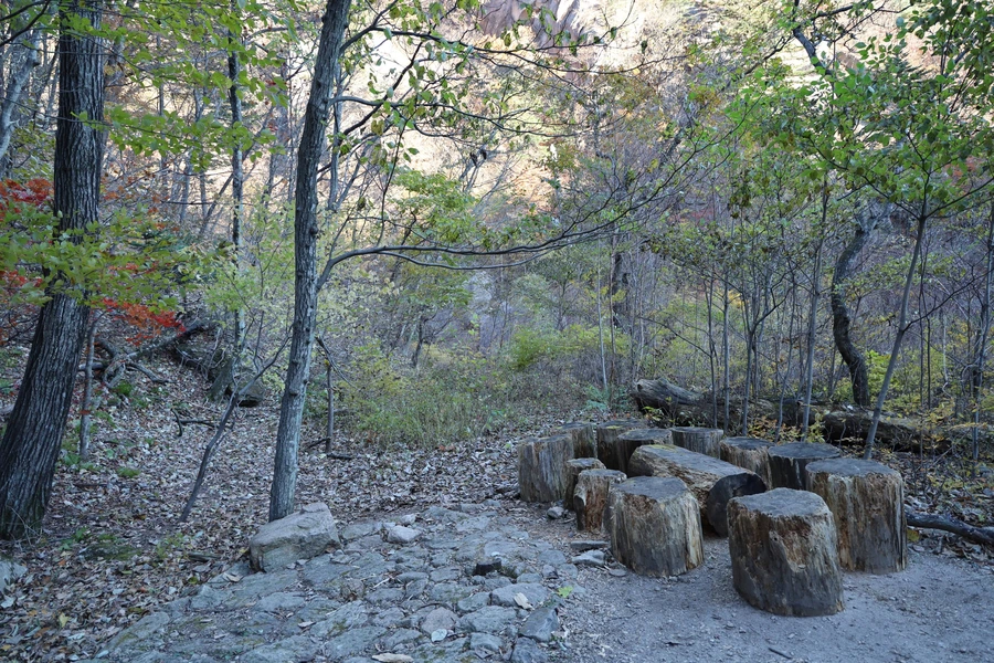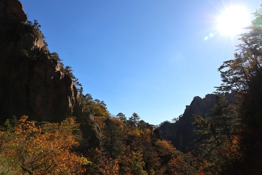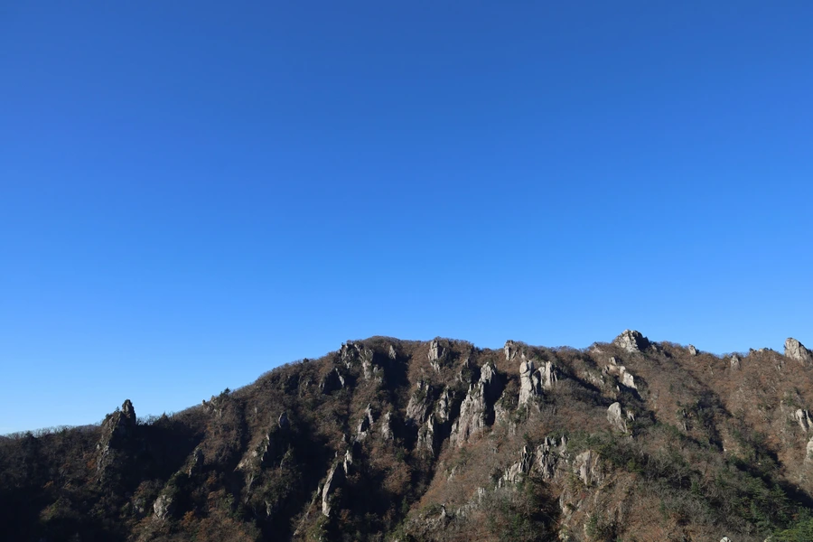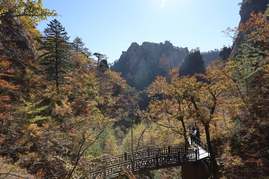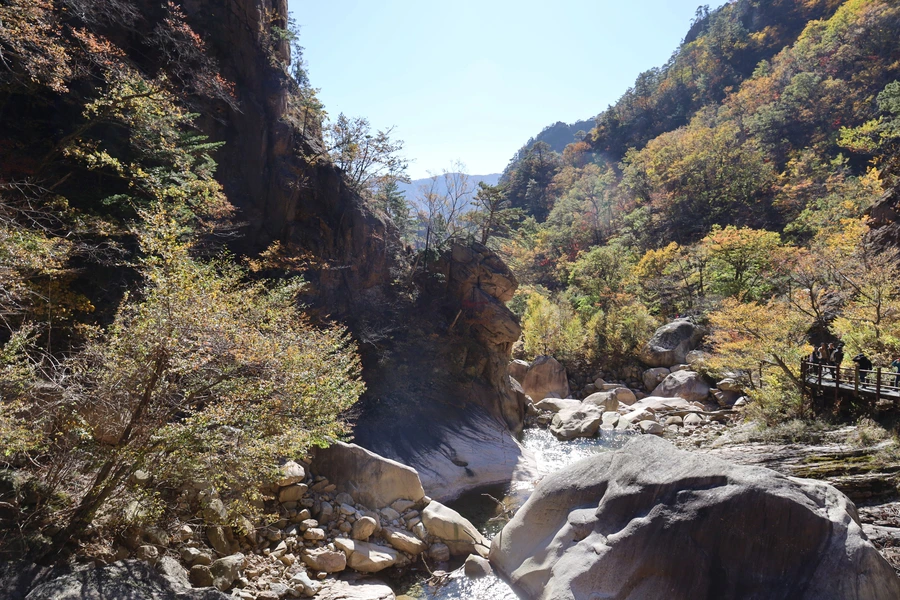 고도가 낮아지면서 단풍색이 보이기 시작한다. 기암괴석과 어울리는, 금강산 못지않은 풍광이 우리 앞에 펼쳐지기 시작한다.
