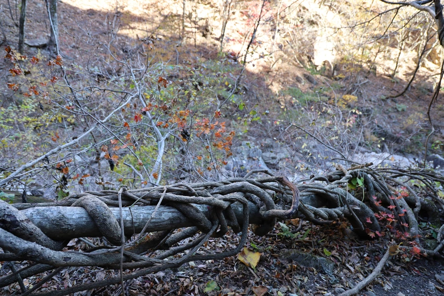 쓰러진 나무에 칡넝쿨인지 엉켜 있는 모습이 눈에 띄었다. 넝쿨이 칭칭 동여매어 얼마나 나무를 못 살게 굴었으면 뿌리가 견디지 못하고 쓰러졌을까. 그것도 자연이 어울려 살아가는 모습의 한 부분이리라