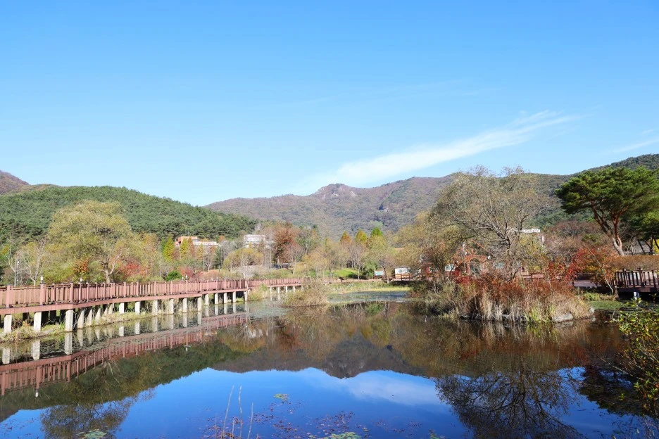 하늘은 맑고, 그 하늘이 비친 연못 또한 맑다.