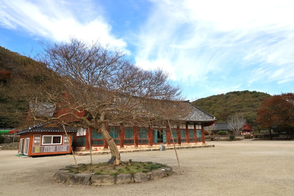 방문객이 적은 편이라 우리도 절마당에 들어가 본다. 오래된 키가 큰 감나무가 인상적이다.