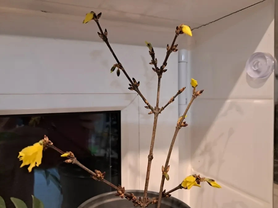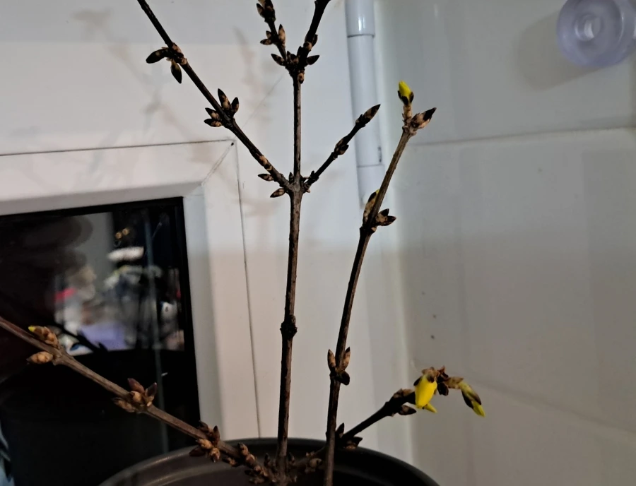 안 되겠지 하면서 물꽂이 설치하고 개나리 가지를 꽂아두고, 설거지할 때마다 들여다보았다.