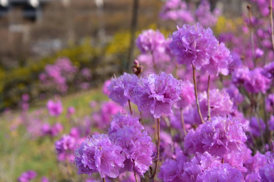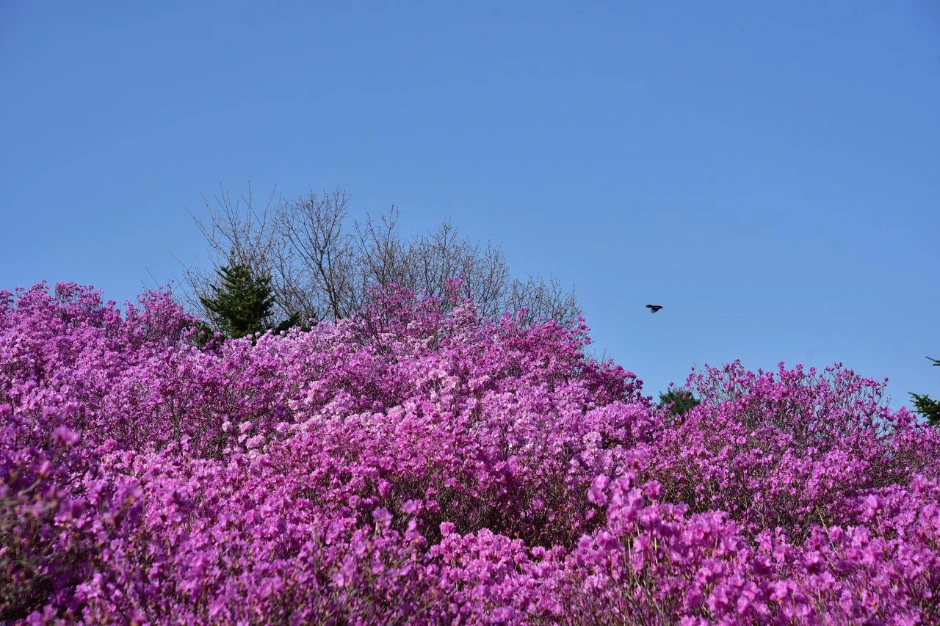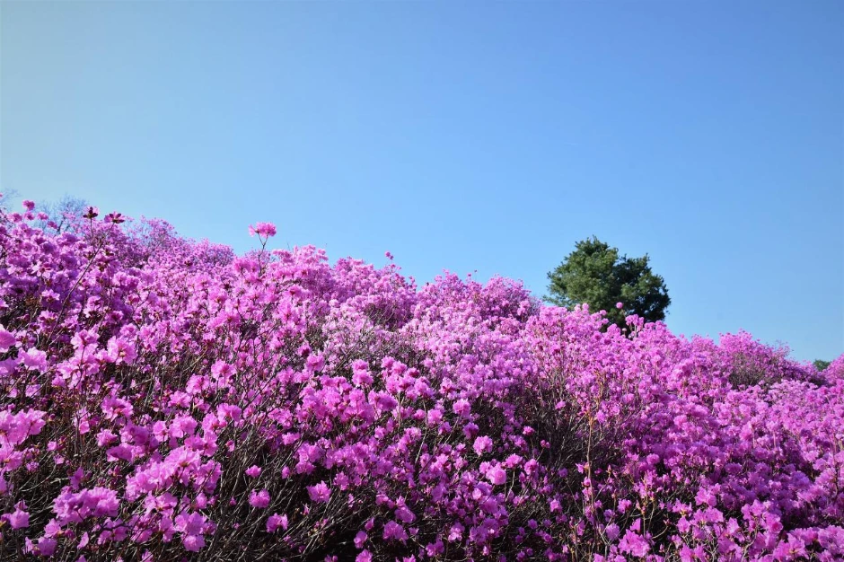 그런데 높은 산에 올라가면 큰 나무가 자라기 어려운 정상 부근에서 진달래 군락지를 만날 때가 있다. 여수 영취산, 창원 천주산, 대구 비슬산 등 진달래 산행지로 유명한 그곳에 피크일 때 가면 진분홍빛으로 온 산자락을 뒤덮는다. 군락지라 만개하면 벚꽃 못지않은 존재감을 진하게 내뿜는 것이다.