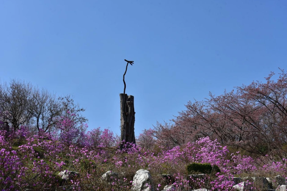 입구를 들어서자 기념식수 표지석이 우리를 맞이한다. 주변의 활짝 핀 진달래 무리가 환하게 눈에 들어왔다. 피크에 제대로 온 느낌이 들었다. 하늘은 파랗고, 꽃은 만개하고. 더 바랄 것이 없었다.