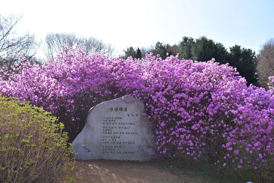 진달래 하면 대표적인 김소월 시인의 시비가 진달래 꽃 더미 속에 파묻혀 있다. 나 보기가 역겨워 가시려다가 진달래의 아름다움에 그냥 돌아와 주지 않을까 하는 생각도 든다. 진달래 동산을 방문한 사람들의 인증 사진을 찍는 포토존이다.