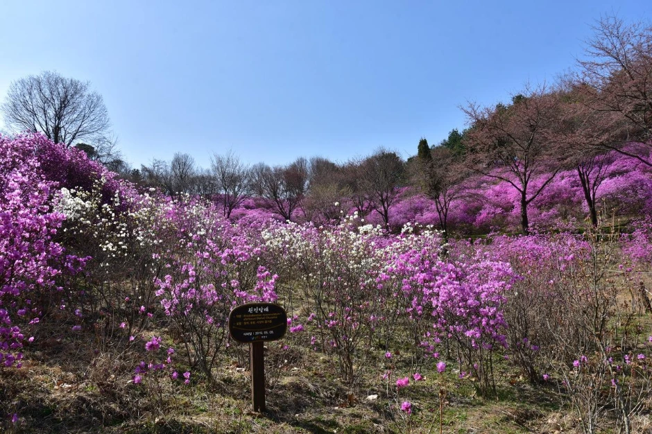 흰 진달래가 있다고 한다. 아니 눈앞에 보였다. 진달래의 변종으로 환경부에서 특정 야생 식물로 보호하고 있다고 하는데, 2019년에 여기에 식재했다고 한다. 바로 앞에 진달래 동산의 포토존이 있어서 많은 사람들이 인증 사진을 찍느라 바빴다.