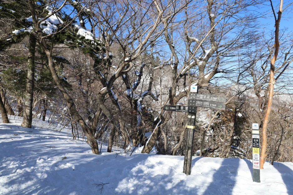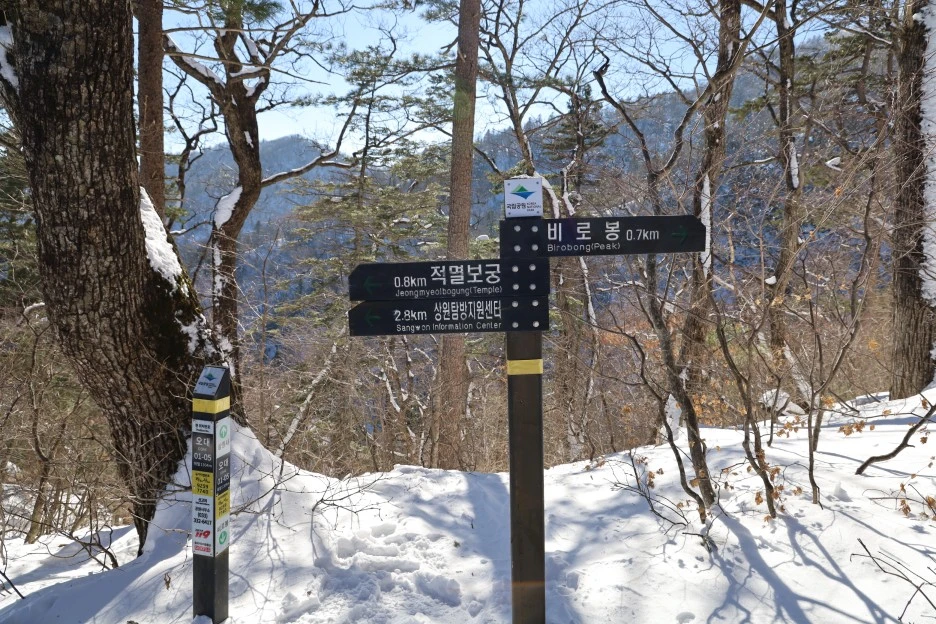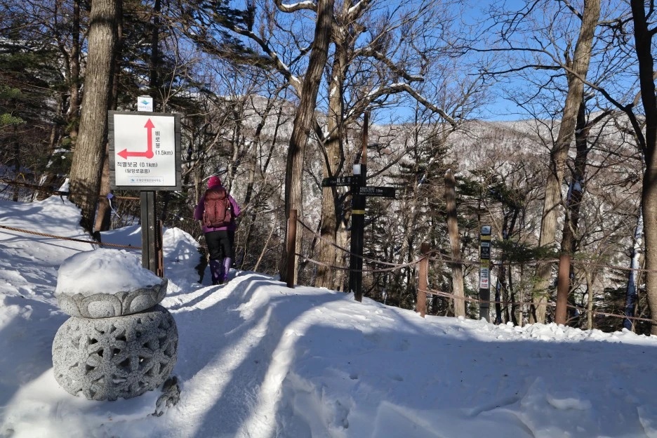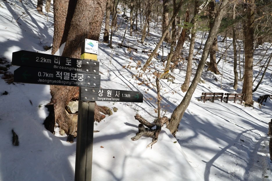 적멸보궁은 왼쪽, 비로봉으로 가는 길은 직진이다. 비로소 흰 눈이 제대로 쌓인 등산로의 시작이다.