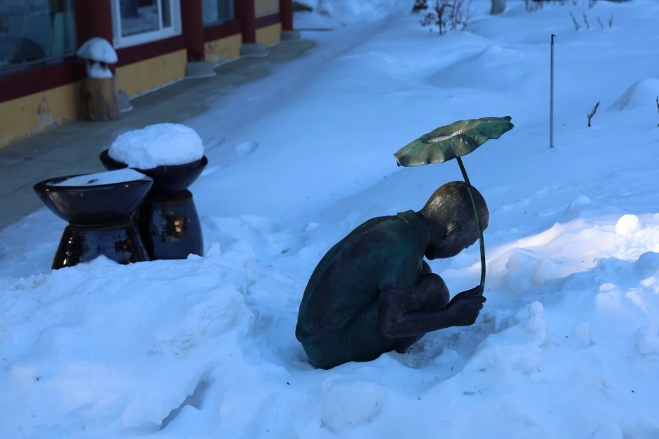 상원사에서 꼭 만나고 싶은 연잎 소년. 눈밭에서 여전히 연잎을 우산처럼 쓰고, 무언가를 찾고 있다.