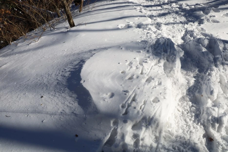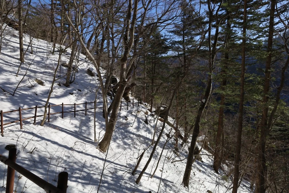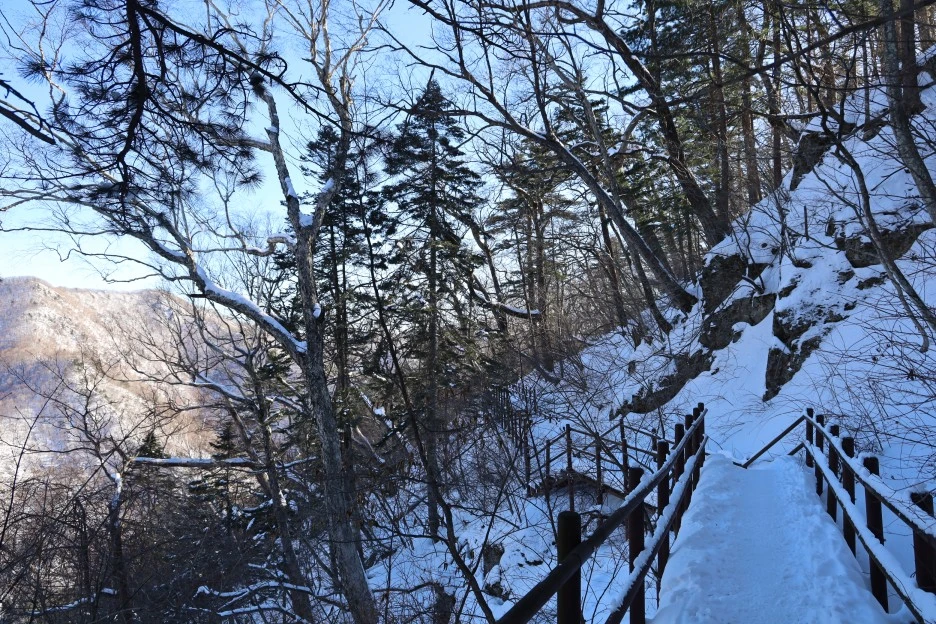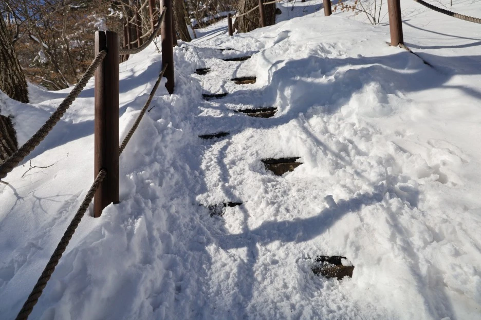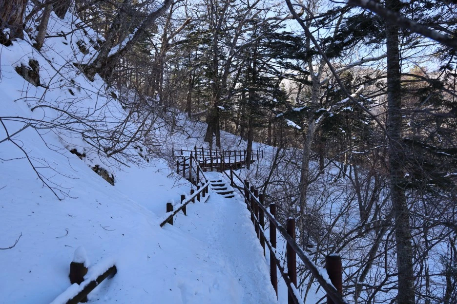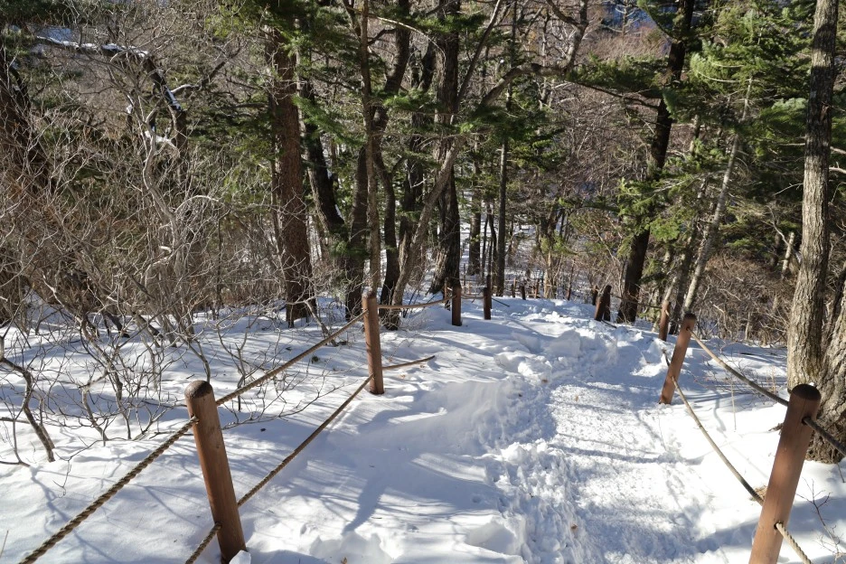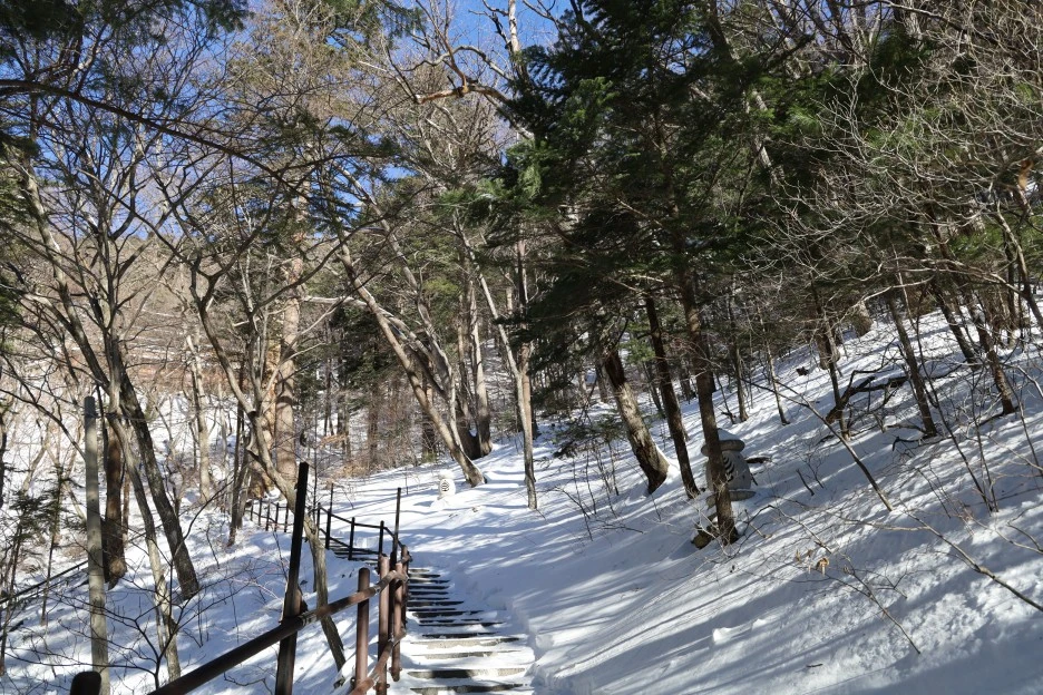 울타리가 길인 줄 짐작이 갈 뿐 많은 눈이 쌓여 계단인지 돌길인지 알 수 없는 이 길에 움푹움푹 발자국 딛는 곳이 만들어져 있다. 적멸보궁 - 비로봉 길은 경사가 급해서 잘못 디디면 미끄러져서 사고 나기 쉬운 곳이다. 오르막보다 내리막이 더 미끄럽고 위험한데, 이런 발자국 길은 친절하게 발 딛는 곳을 안내해 주니 참 고마운 발자국이다.