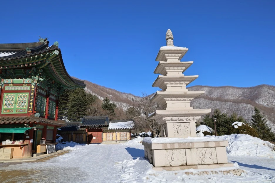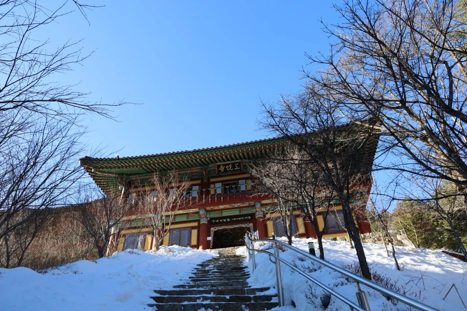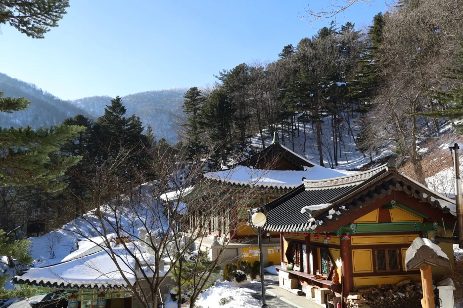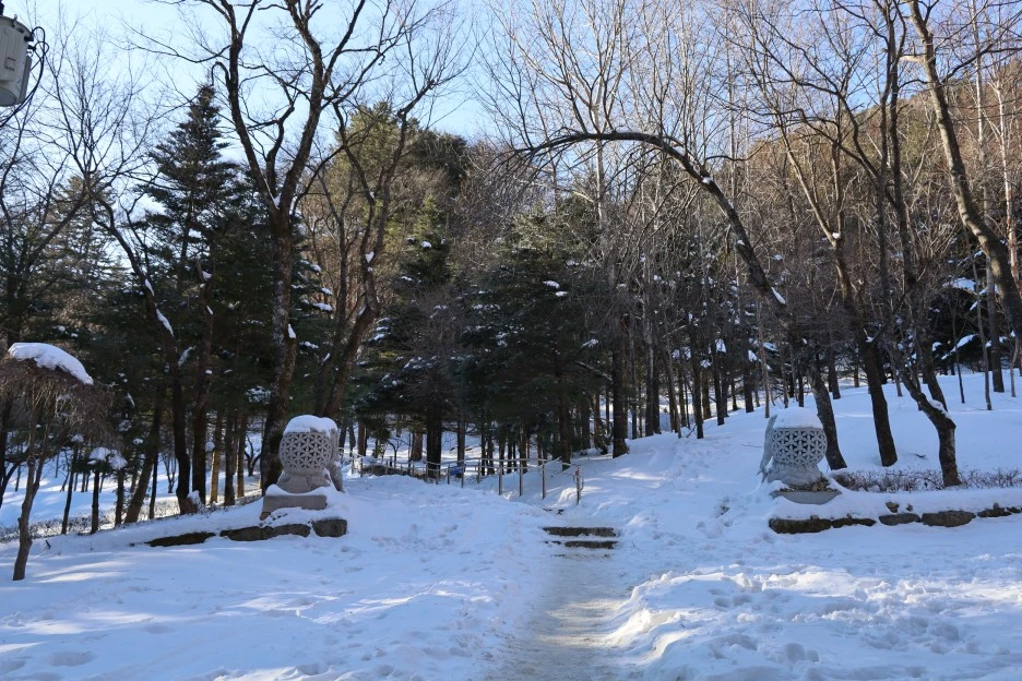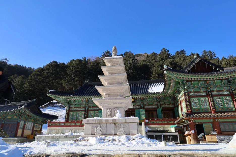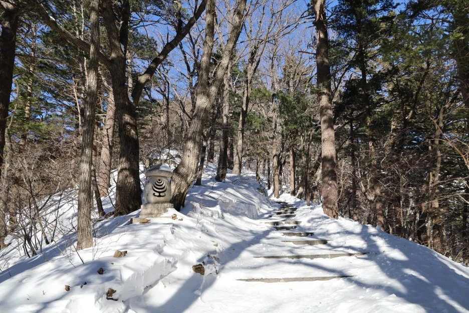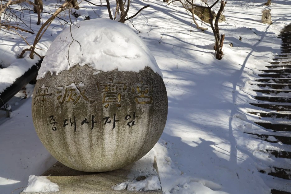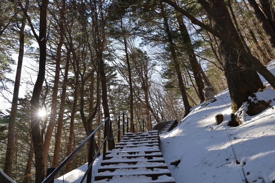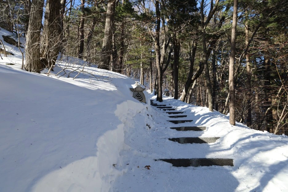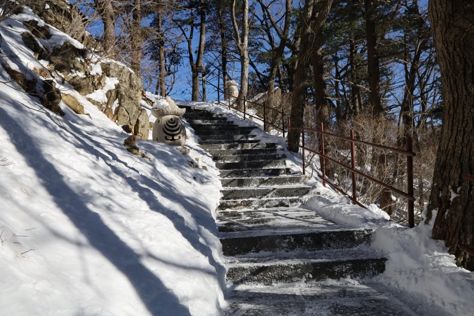 아침에도 눈을 쓸고 있더니, 하산길에도 눈을 쓸고 있는 사람들을 만났다. 적멸보궁까지 신도들이 안전하게 다닐 수 있도록 배려하는 것이다. 훤히 드러난 계단이 부처님 마음처럼 훈훈하다.