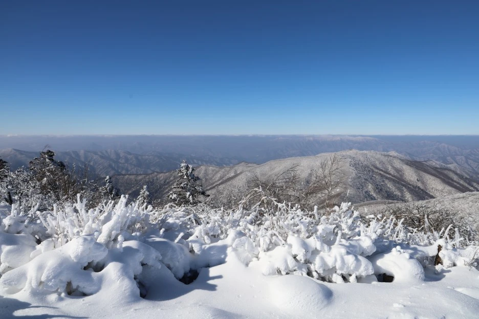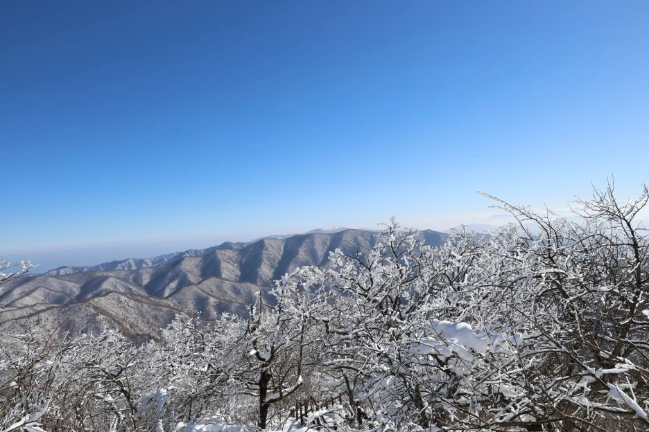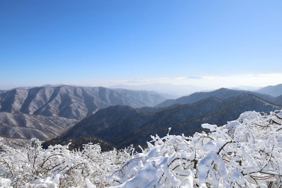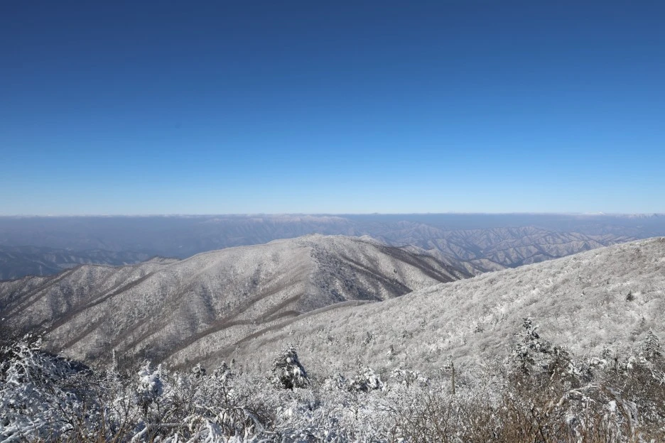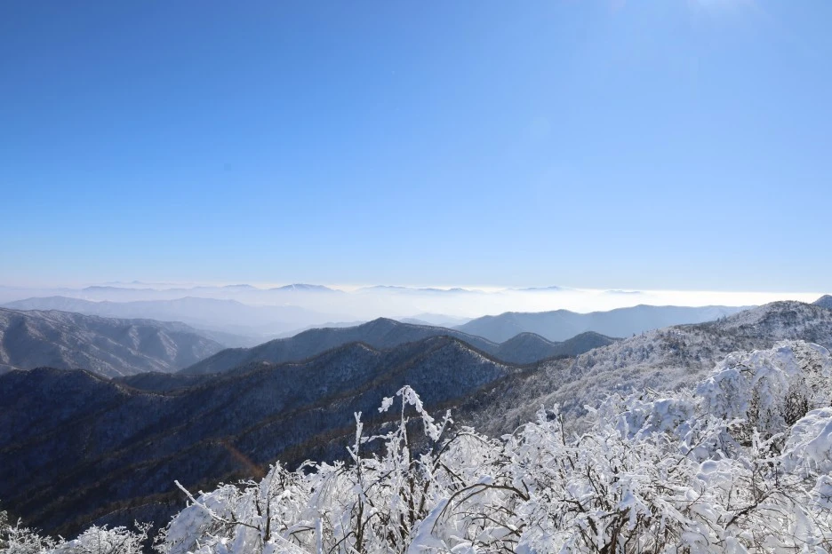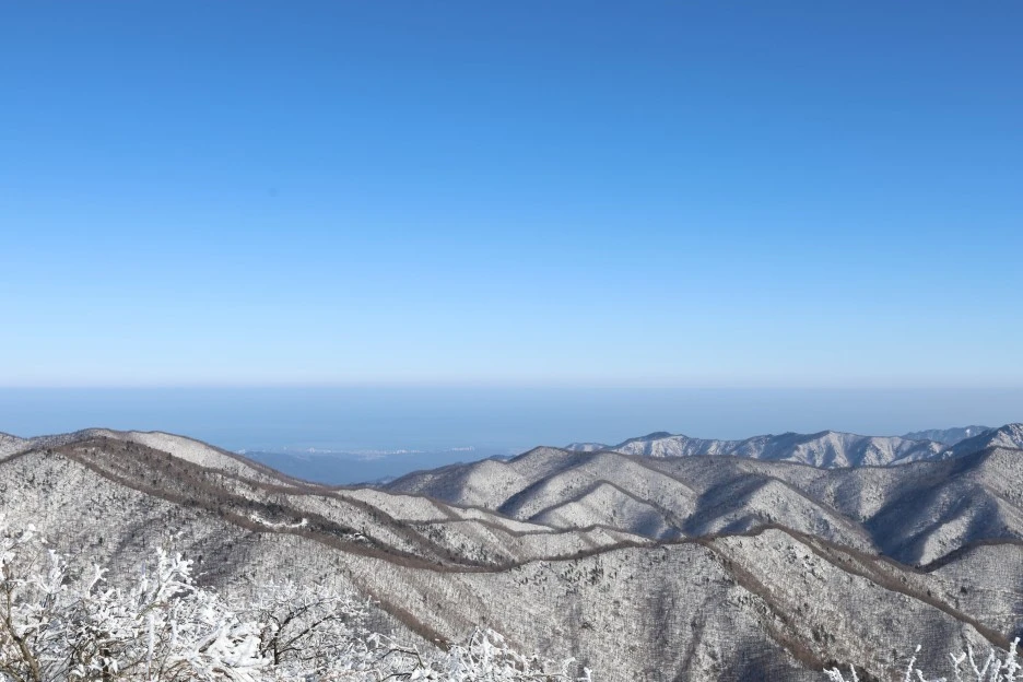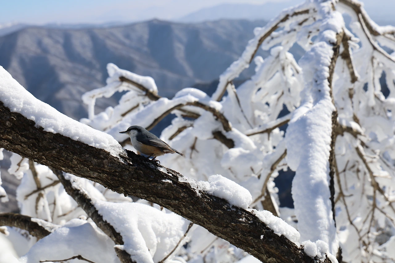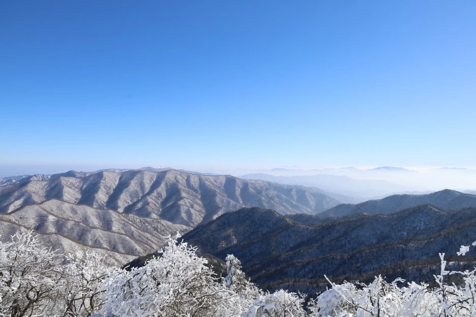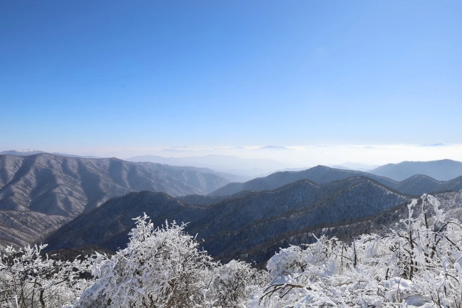 내가 참 좋아하는 풍경이다. 눈꽃 사이로 보이는 눈 덮인 산그리메의 모습이 단아하다.
