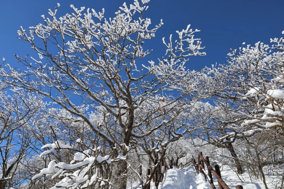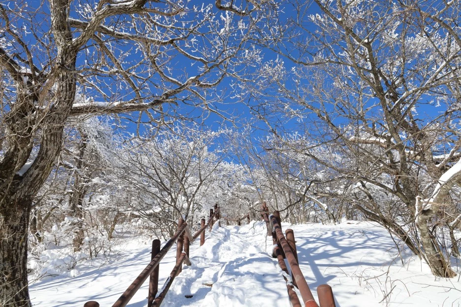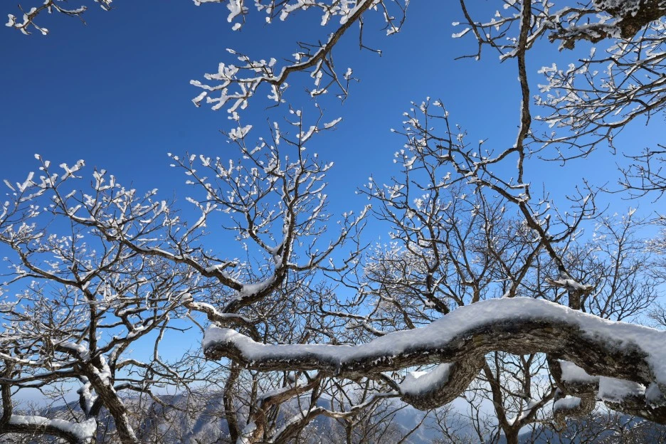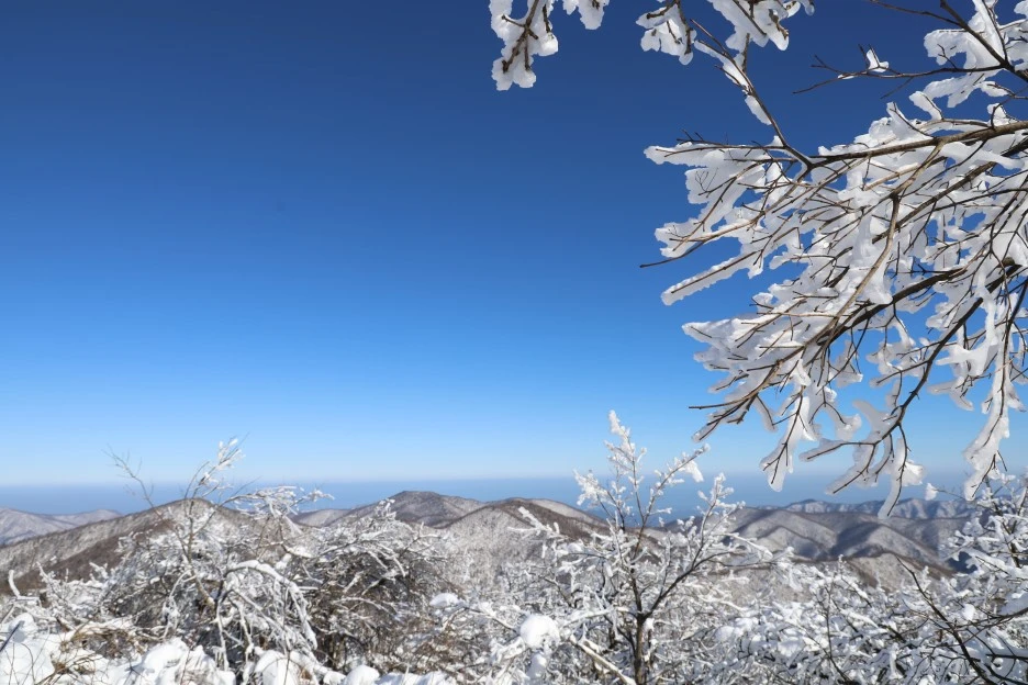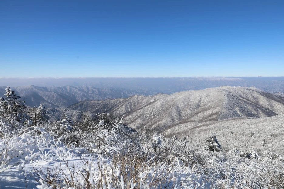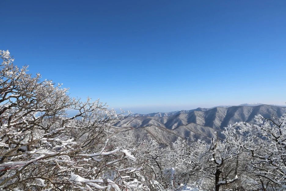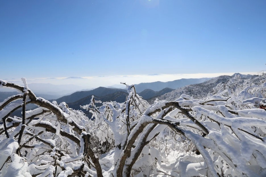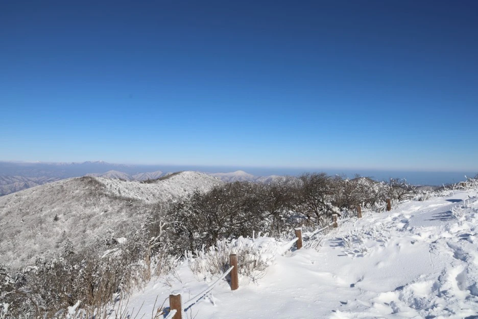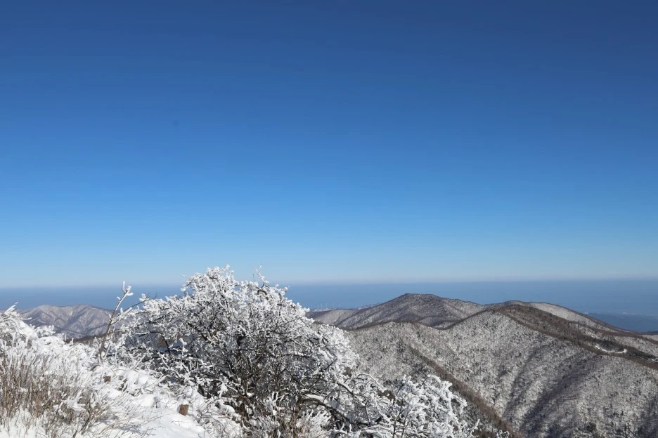 내가 참 좋아하는 풍경이다. 눈꽃 사이로 보이는 눈 덮인 산그리메의 모습이 단아하다.