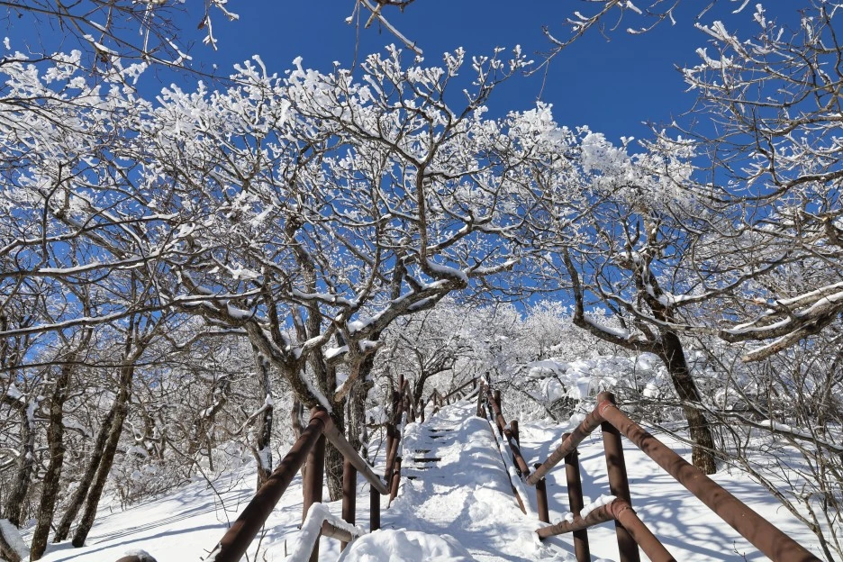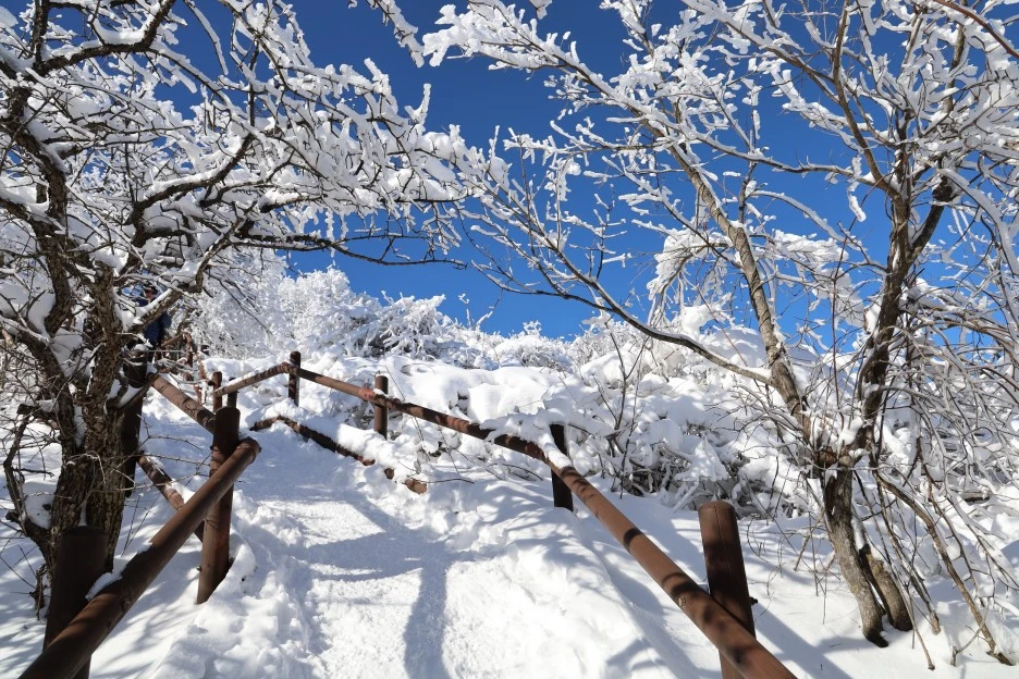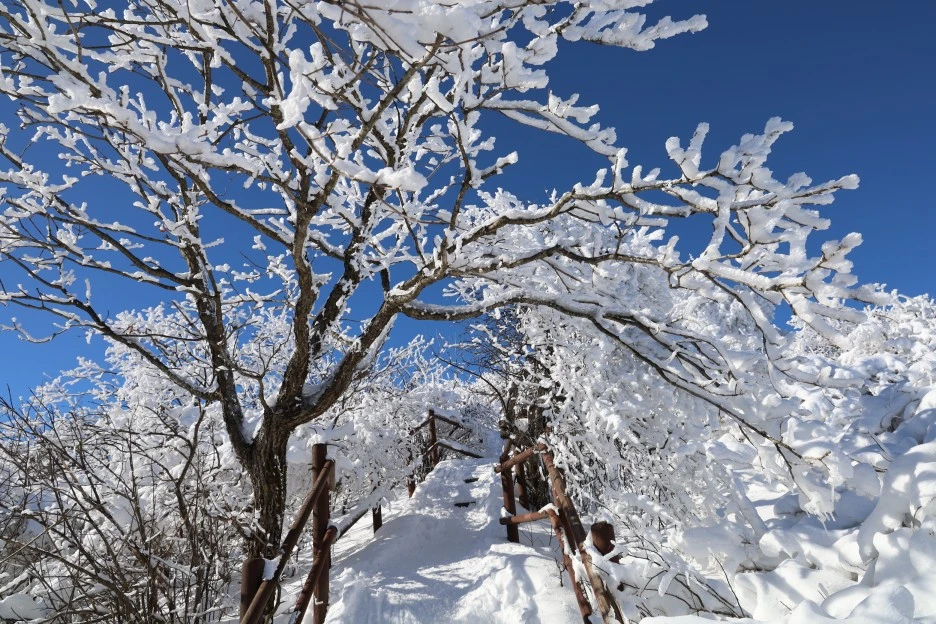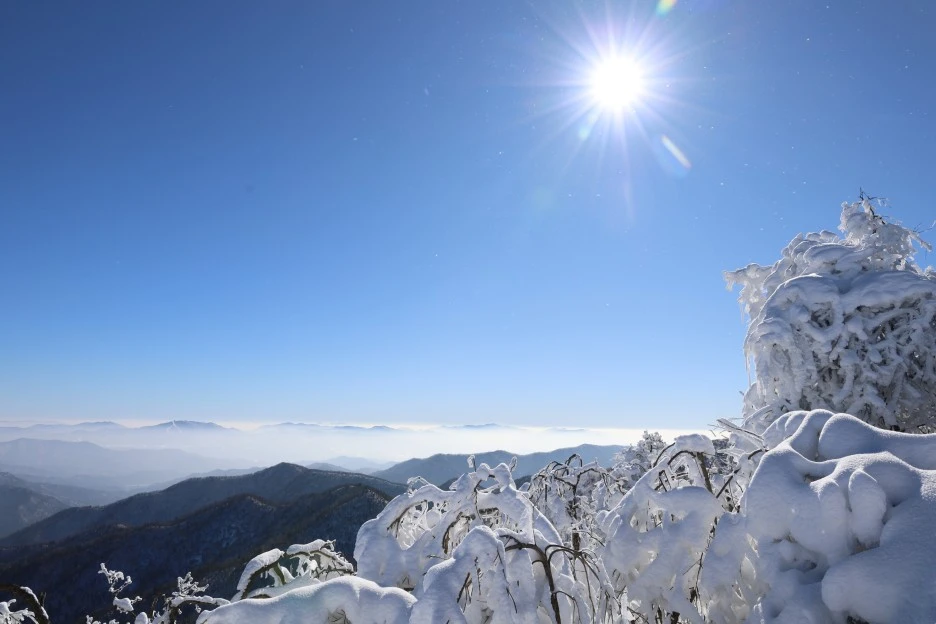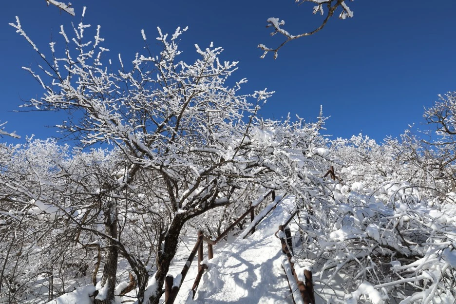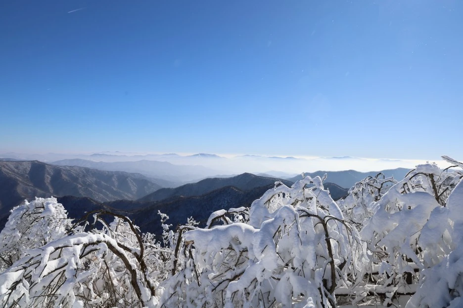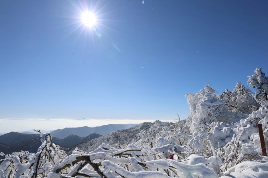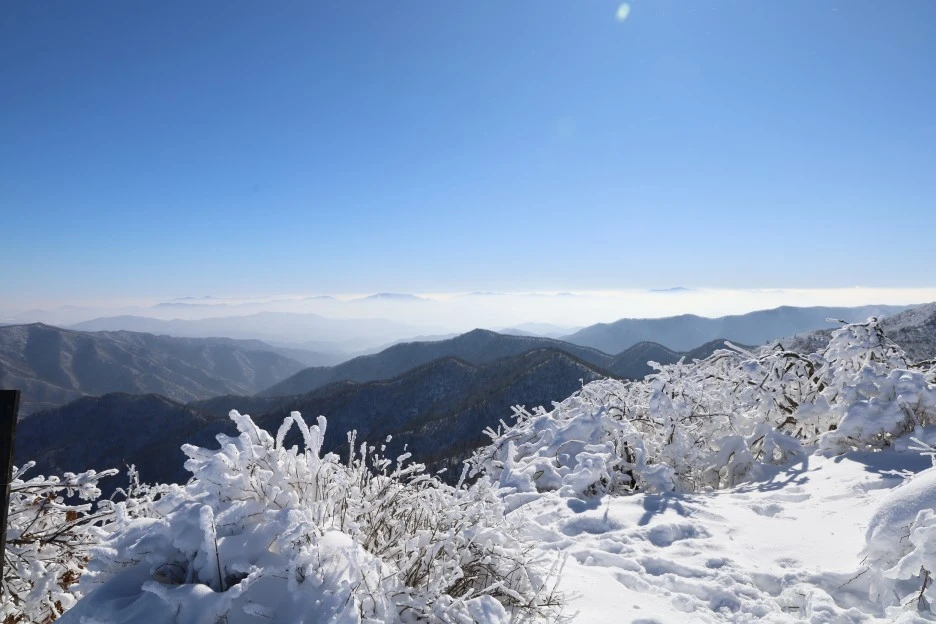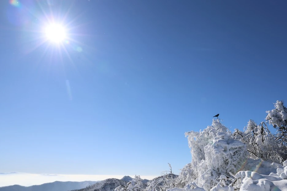 우리보다 늦게 올라온 단체객들의 환성이 소란하다. 아마 아래에서는 보지 못했던 아름다운 설경에 절로 터져 나오는 감탄사일 것이다. 정상까지 올라와야 볼 수 있는 이 모습을 보려고 낑낑대고 겨울 눈산을 오르고 또 올랐을 테니, 그 성취감이 대단할 수밖에.