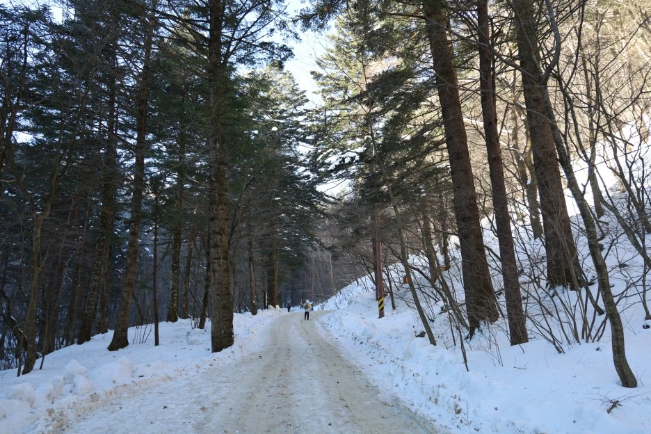 눈 속에 침엽수림이 푸르르다. 전나무인 것 같다.