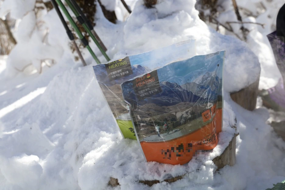 전투 식량이라고 한단다. 인터넷으로 사 두었던 것을 처음 가지고 올라왔다. 바깥 봉지에 물을 붓고 발열체를 넣으면 물이 끓어서 밥이 든 봉지를 데워서 따뜻한 밥을 먹을 수 있게 하는 것이다. 소고기 비빔밥과 김치 비빔밥 두 가지였는데, 물을 좀 많이 부어서 약간 질척했을 뿐 먹을 만했다. 특히 따뜻한 봉지는 난로 같아서 한참을 손에 쥐고 온기를 즐겼다. 차가운 눈밭에서 펄펄 끓어오르는 수증기를 보는 것만 해도 특별한 경험이었다.
