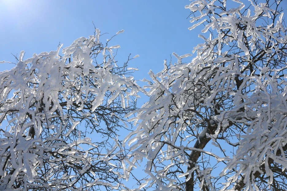 그런데! 자세히 보니 평소에 접하던 상고대의 모습이 아니다. 얼음이 가지에서 꽃을 피우고 있다.