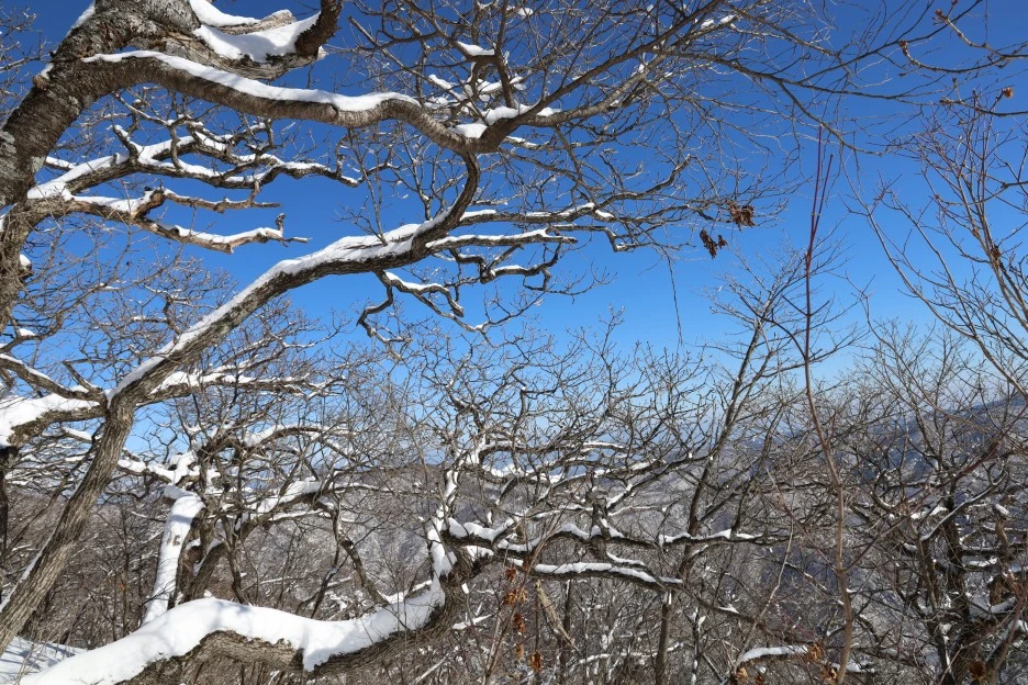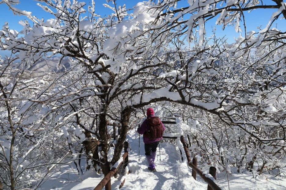 파란 하늘과 흰 눈을 같이 보아야 제격이다. 구름 한 점 없는 맑은 날씨가 겨울 산행의 큰 조력자이다.