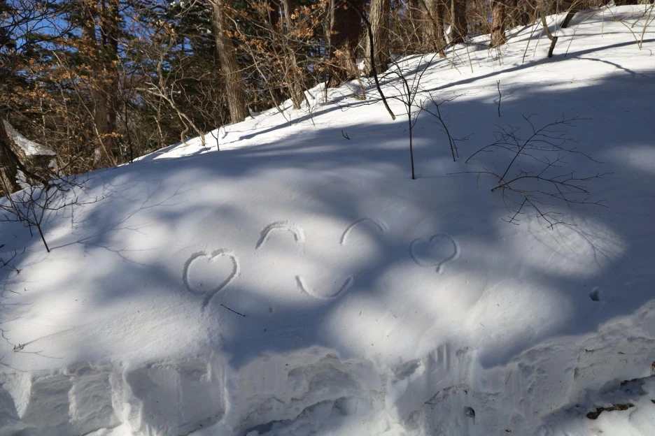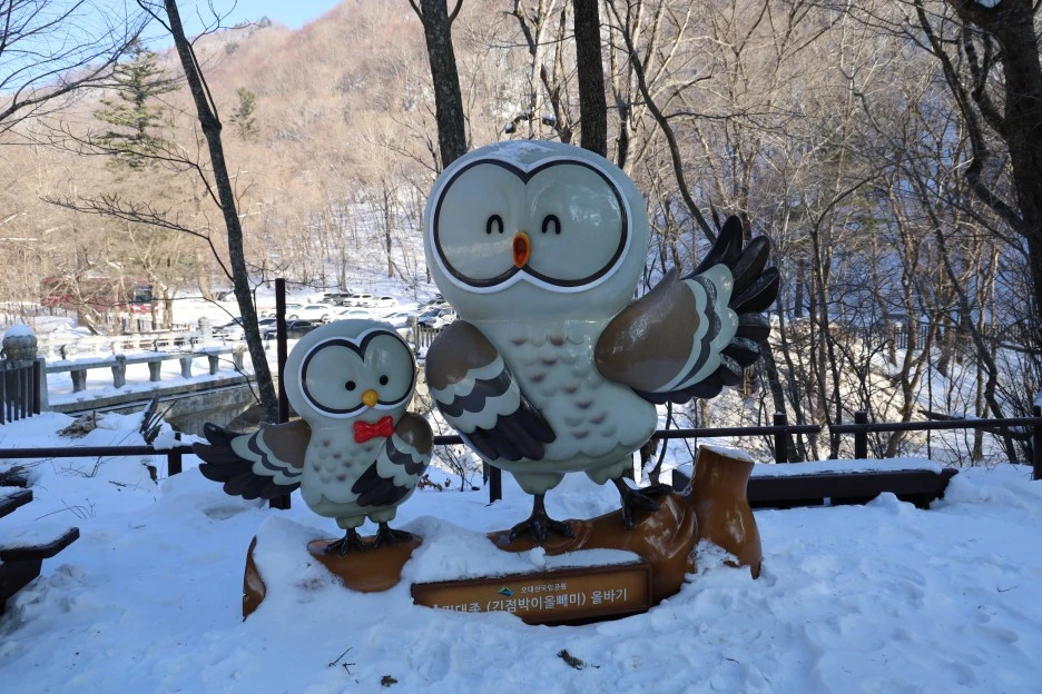 깃대종 캐릭터 올바기(긴점박이 올빼미)를 하산하면서 보았다. 남편이 미리 찍어놓았다. 흰 눈과 잘 어울리는 깔끔하고 귀여운, 친근감 가는 올바기가 곧 오대산의 명물이 되지 않을까 싶다.