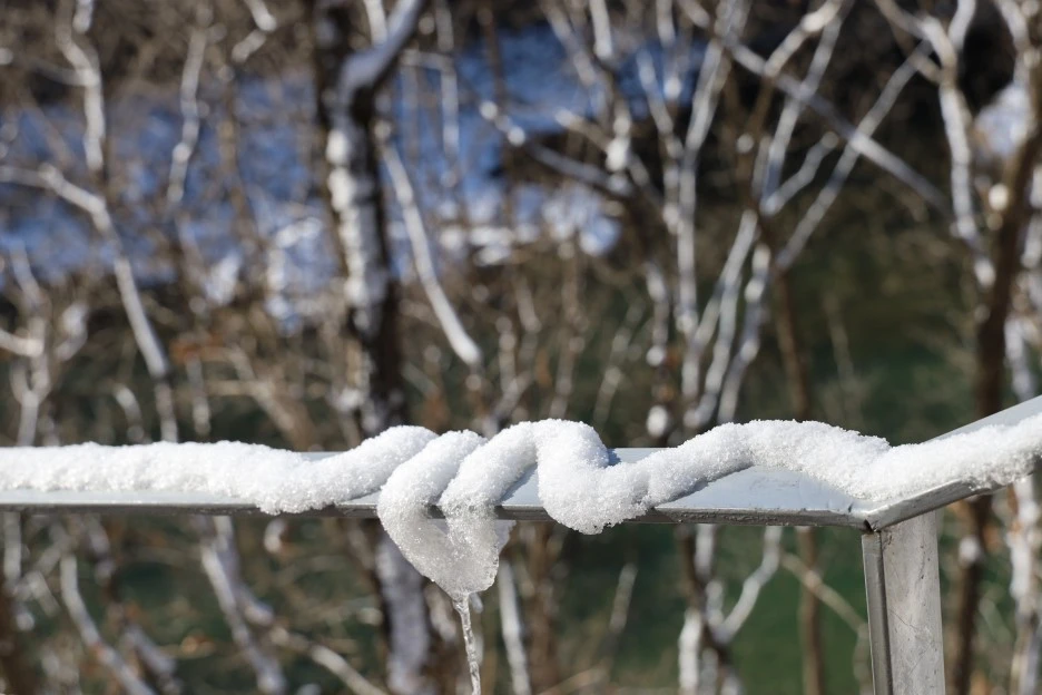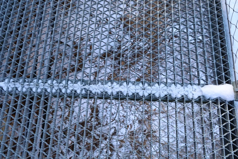 철망에 눈이 쌓이지 못하고 다 밑으로 빠졌는데, 이음새 부분에 남아있는 눈이 전통 문양처럼 예쁘다.