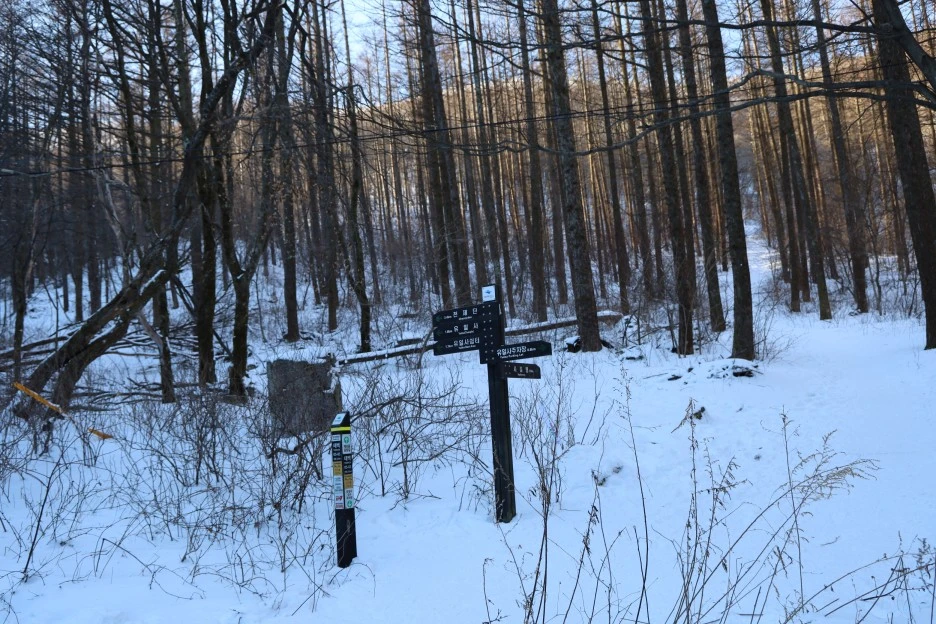 유일사 등산로는 태백산 정상으로 가는 가장 짧은 코스다. 게다가 반 정도의 등산로가 임도로 이루어져 있기 때문에 산행객들이 많이 몰리는 코스이기도 하다. 하지만 이곳 이정표에서 갈라져 올라가는 등산로는 경사가 급한 산길이라 초보 등산객이 오르기에는 힘든 길이다. 우리는 여러 번 다녀보았기 때문에 하산 길에 그곳으로 내려오기로 했다. 남편이 똑같은 코스로 원점회귀하는 것을 선호하지 않는 편이다.