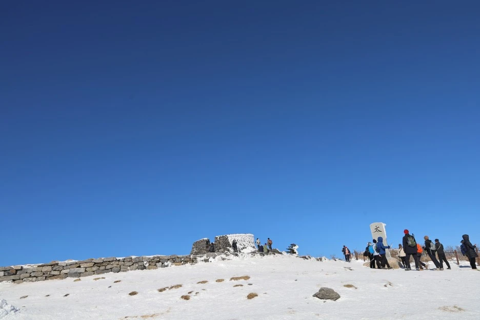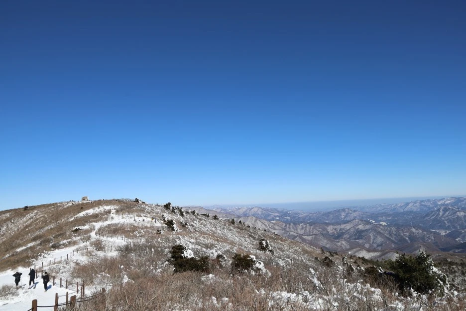능선에 올라서면서 파란 하늘이 시원하게 다가온다. 하얀 눈길과 어울려 눈 산행의 즐거움이 배가된다.