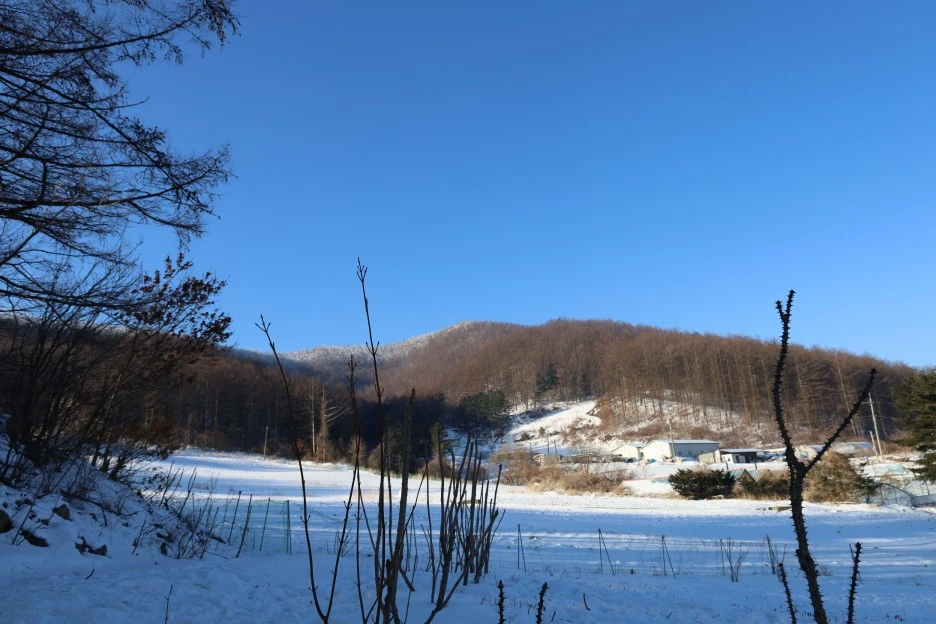 들머리에서 늘 대하는 너른 밭은 하얀 눈밭이 되어 우리를 반긴다.