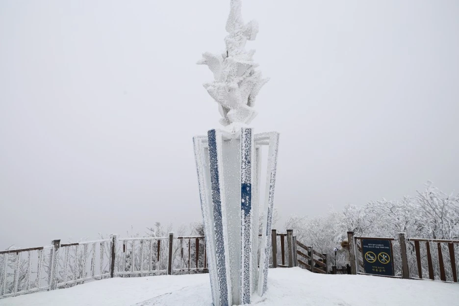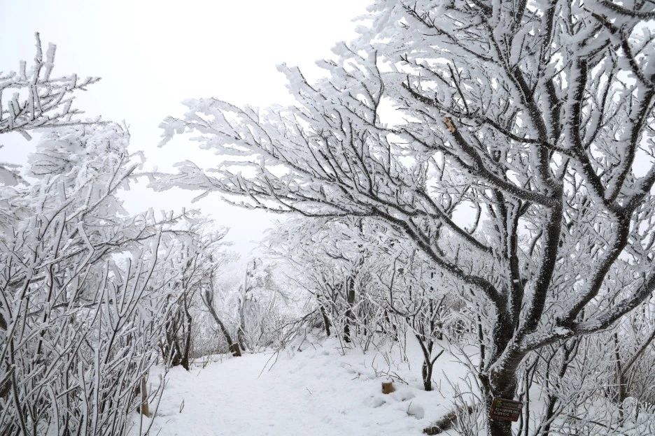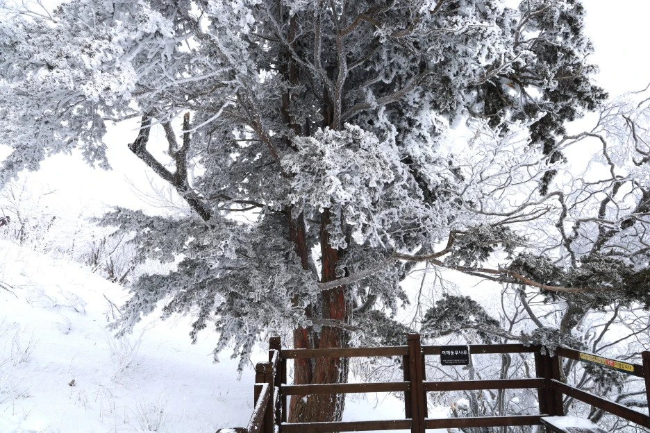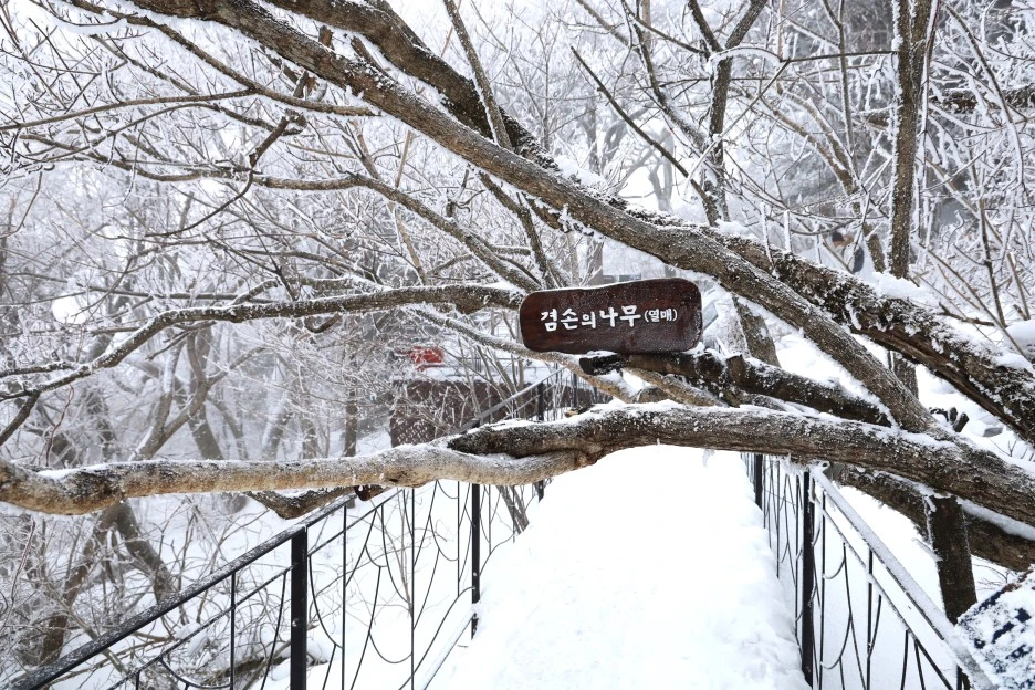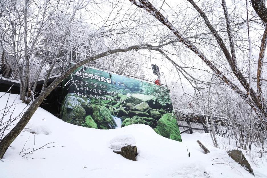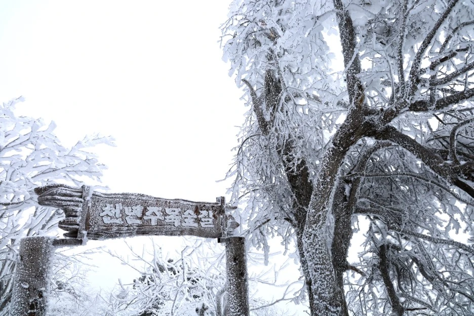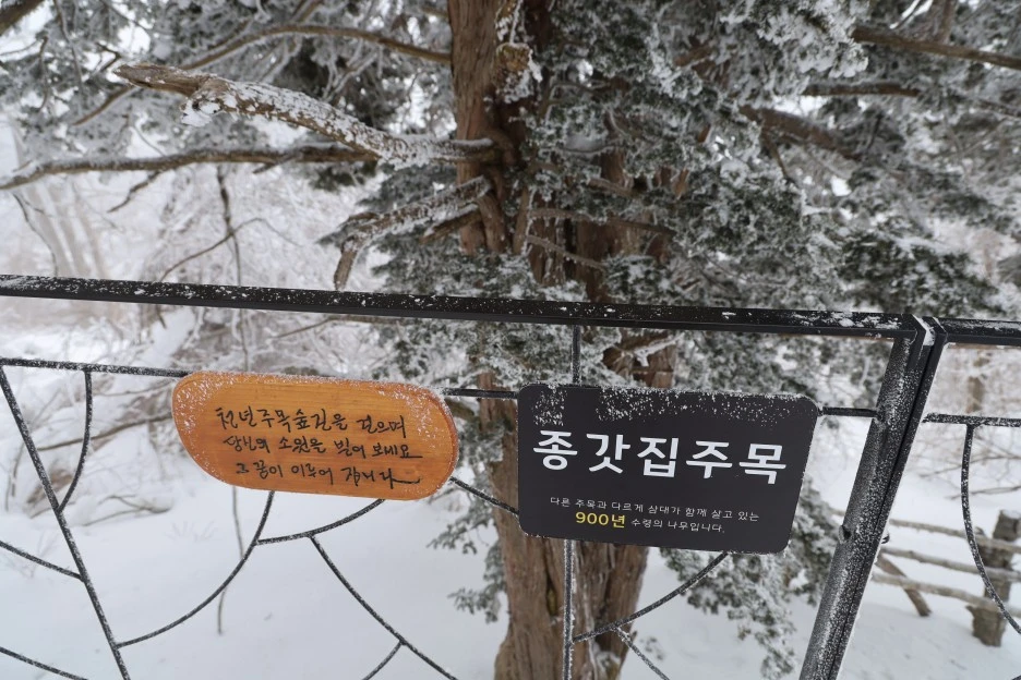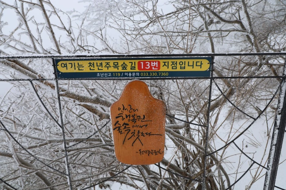 천년주목숲길 표지판도 상고대로 하얗게 변신했다.