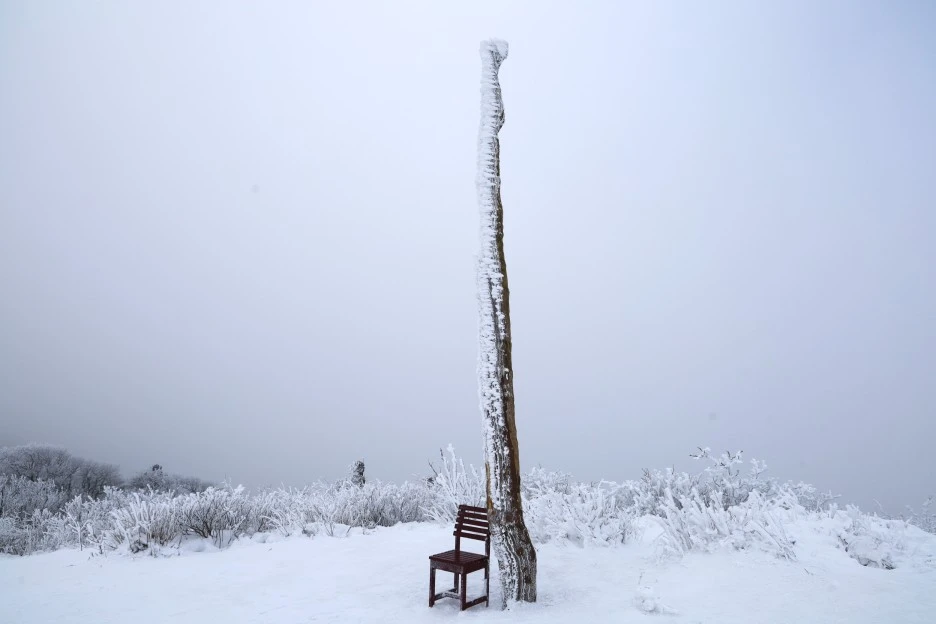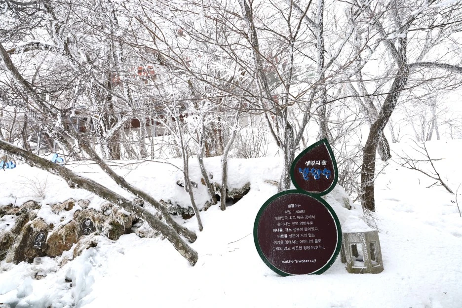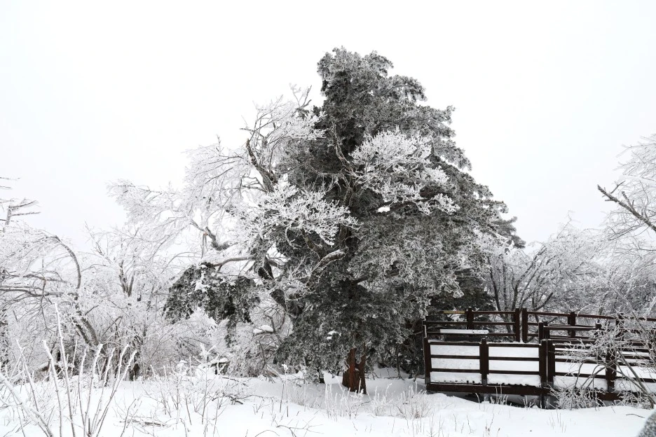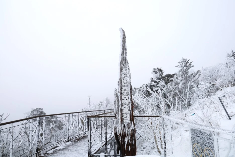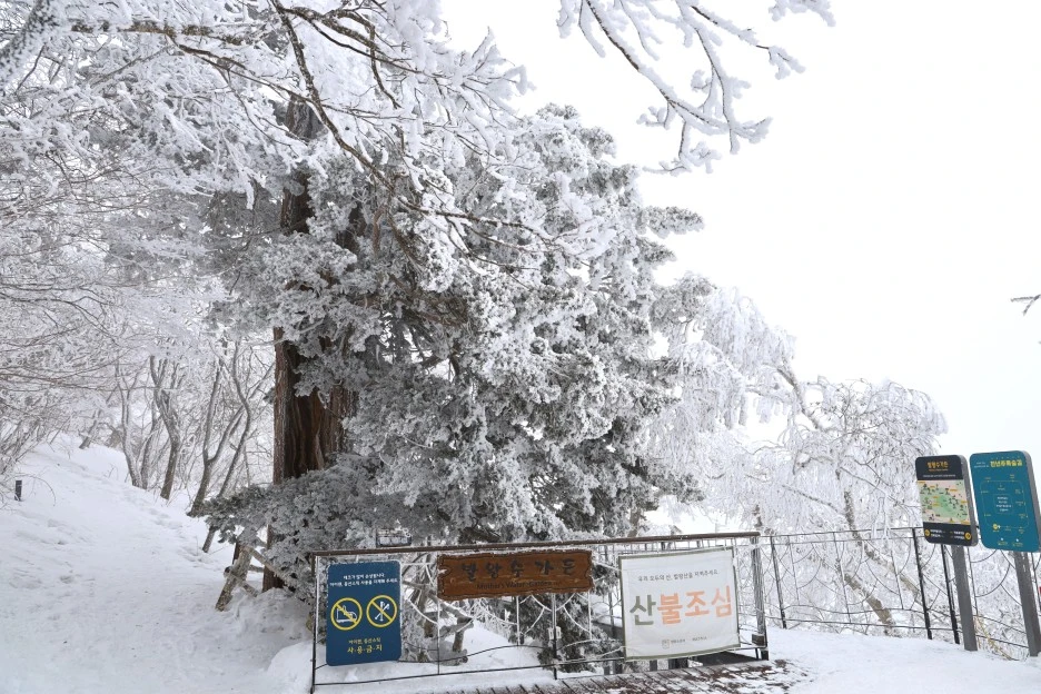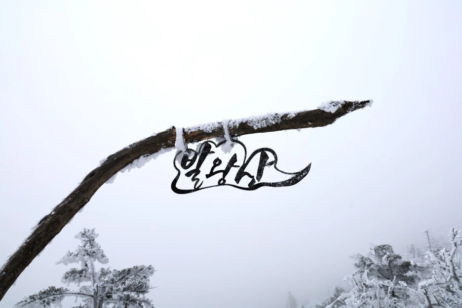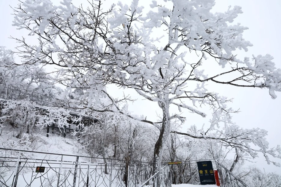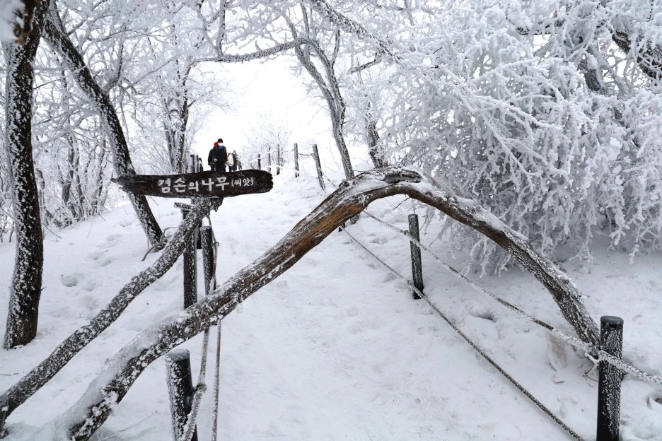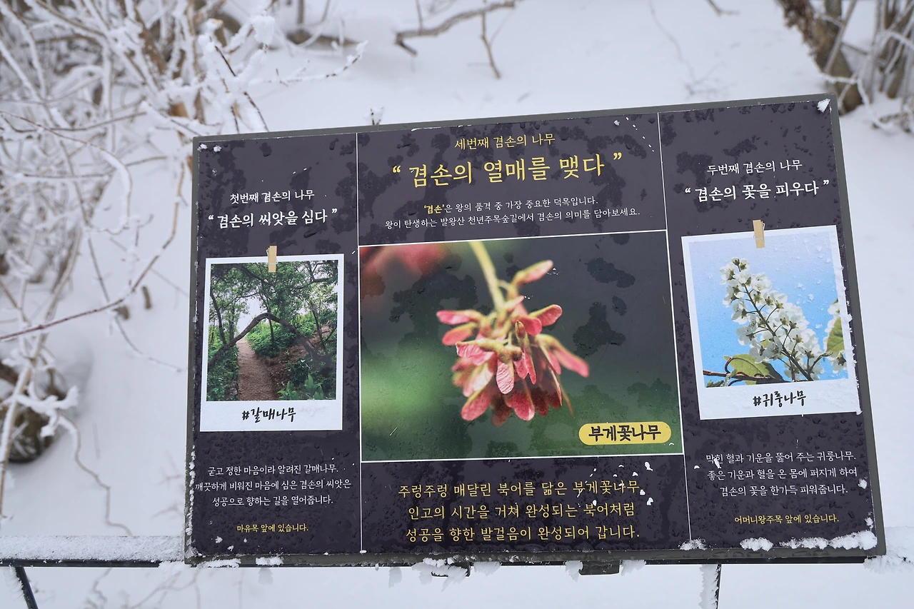 천년주목숲길 표지판도 상고대로 하얗게 변신했다.