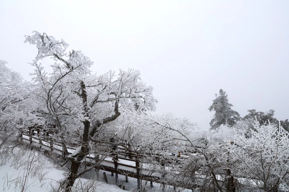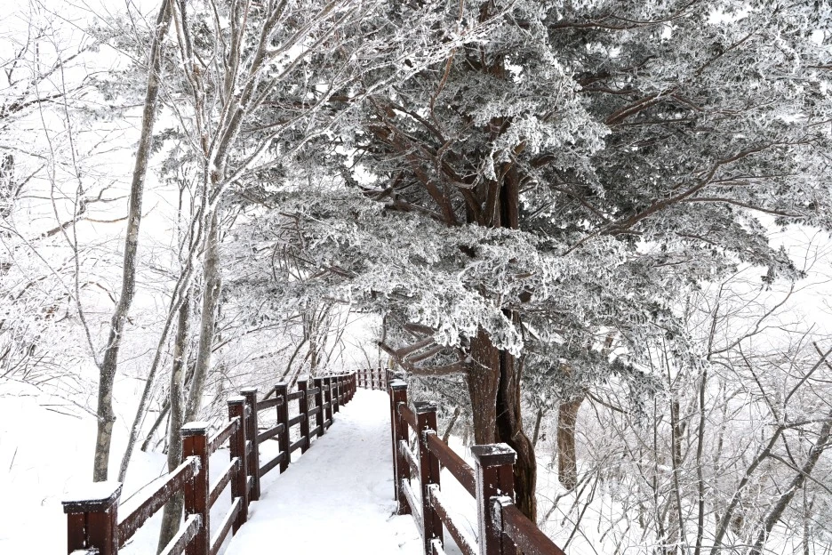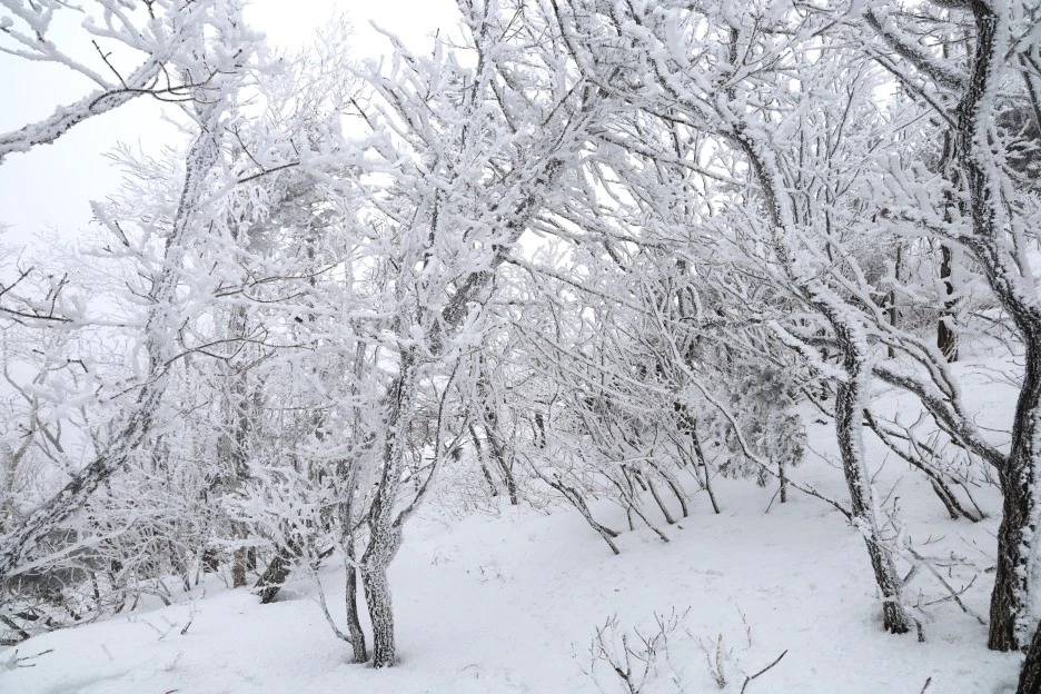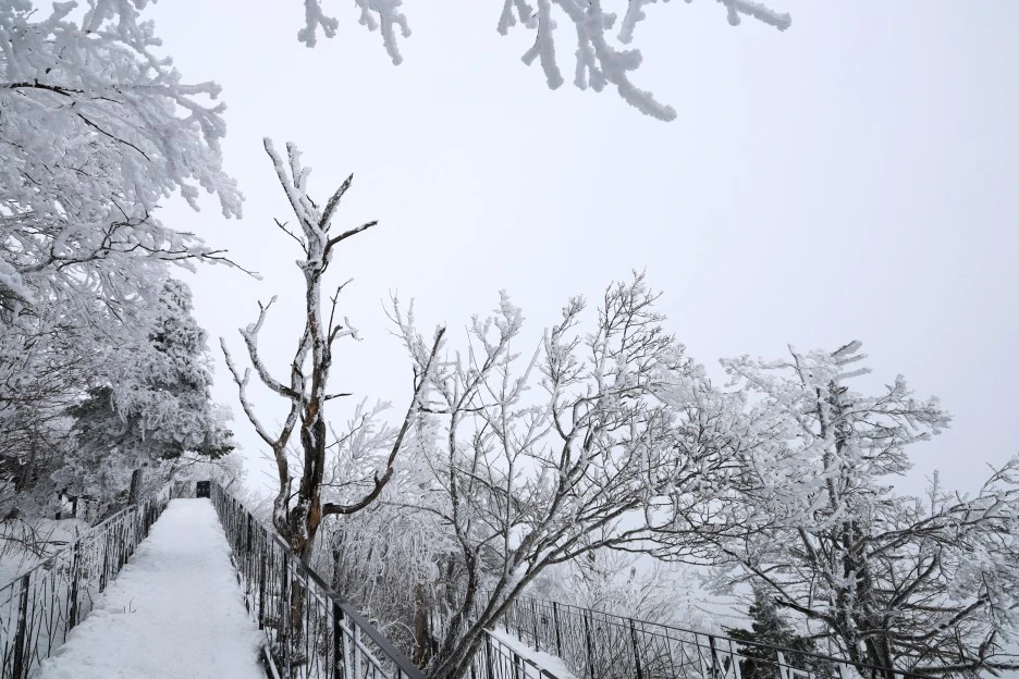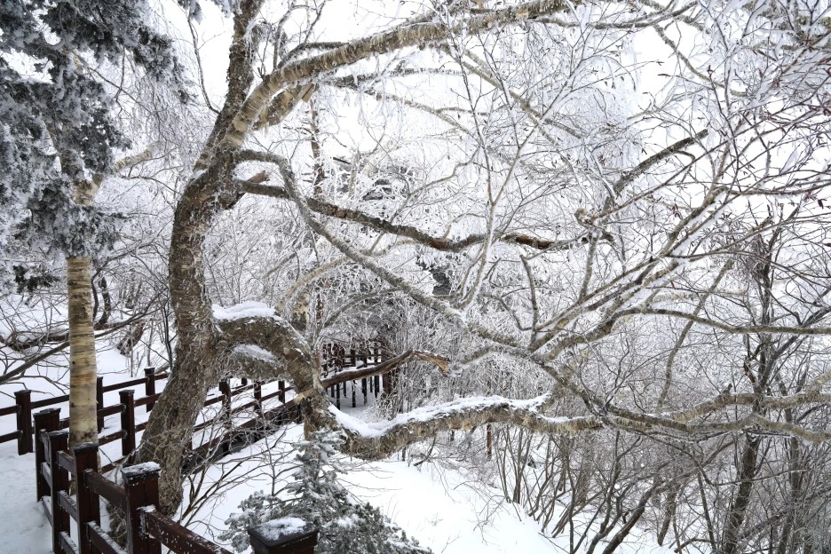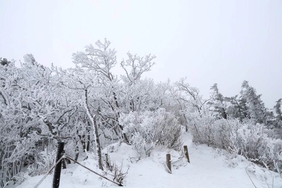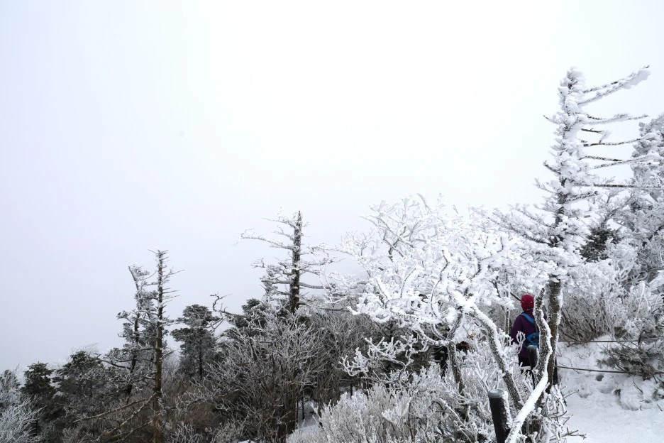 바로 앞의 하얀 숲 뒤에는 안개 속이다. 아래에서 보면 구름 속일까. 구름 속의 신선처럼 설국을 걸어볼까나.