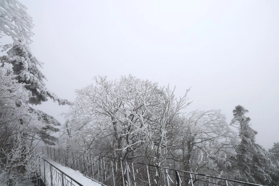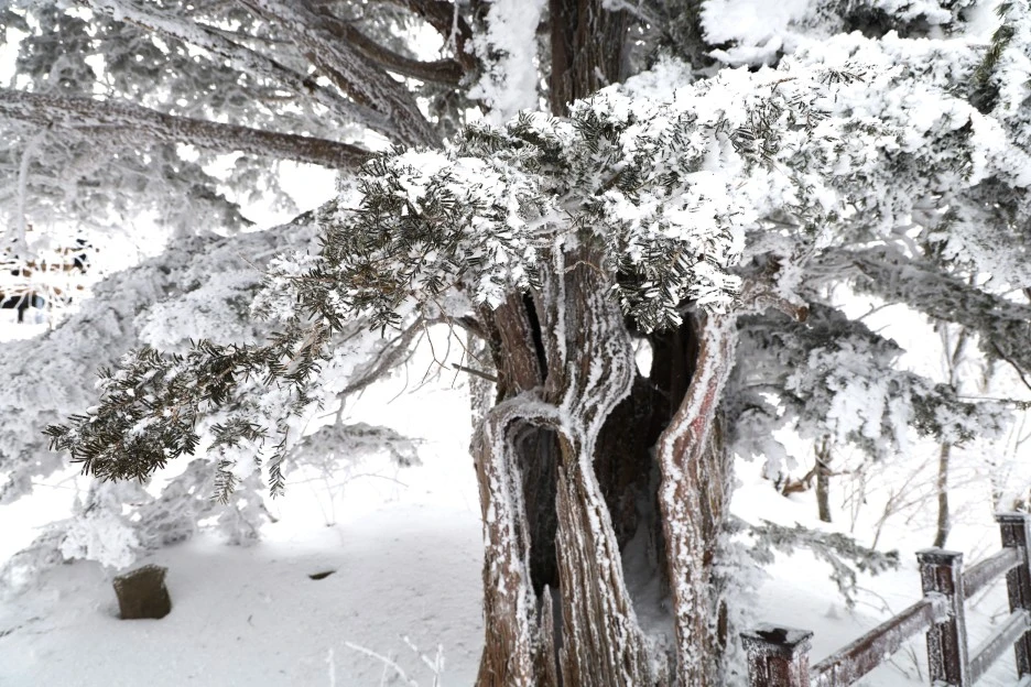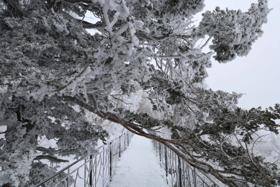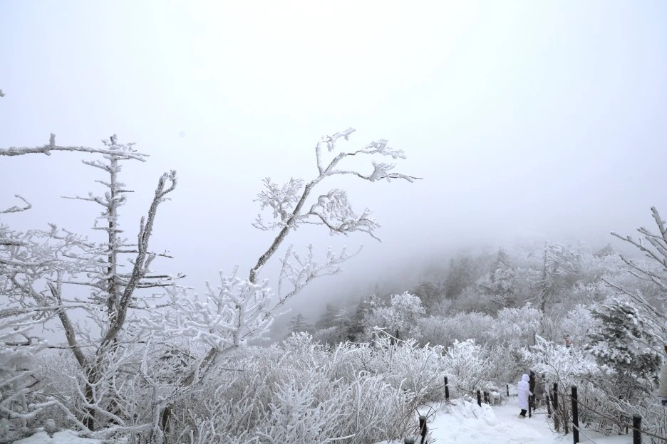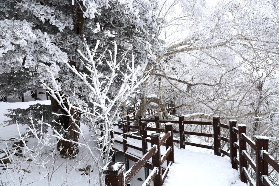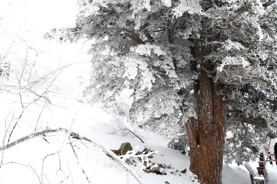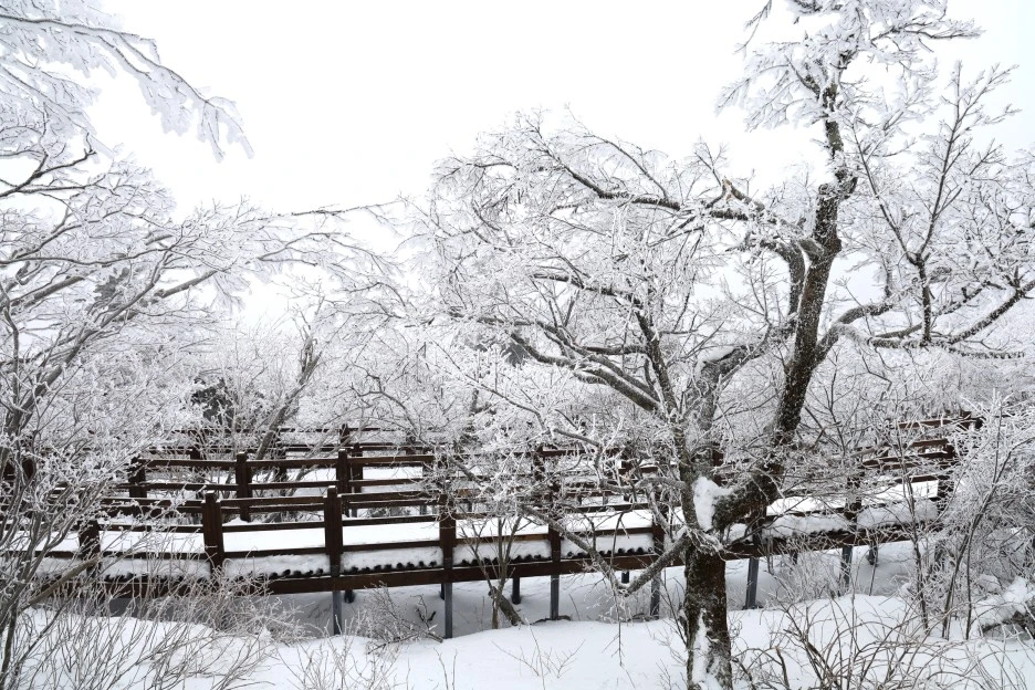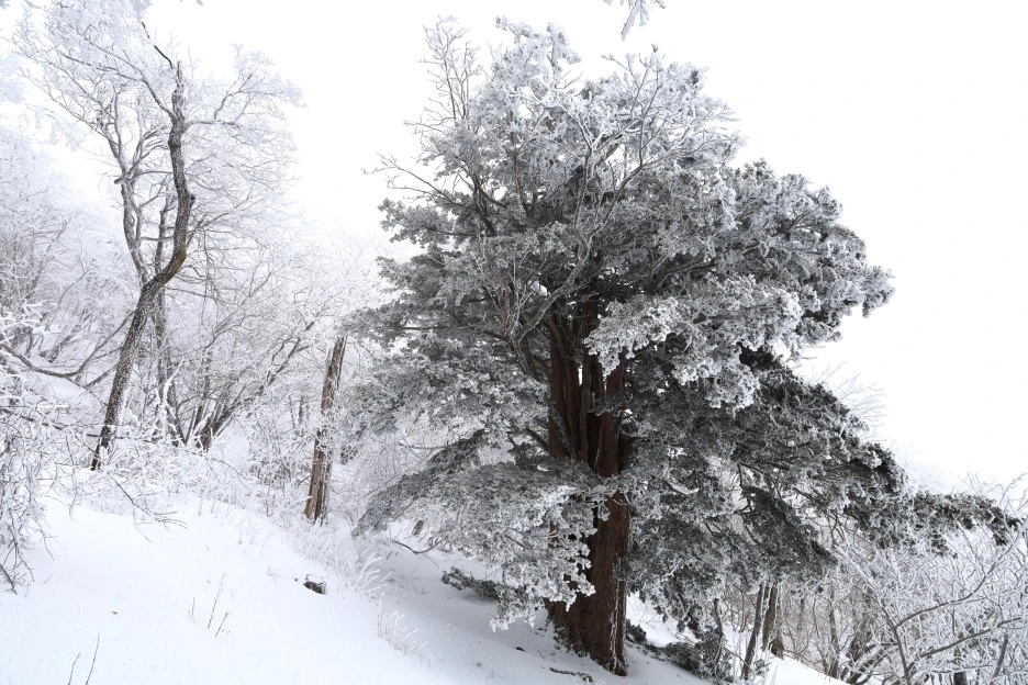 바로 앞의 하얀 숲 뒤에는 안개 속이다. 아래에서 보면 구름 속일까. 구름 속의 신선처럼 설국을 걸어볼까나.