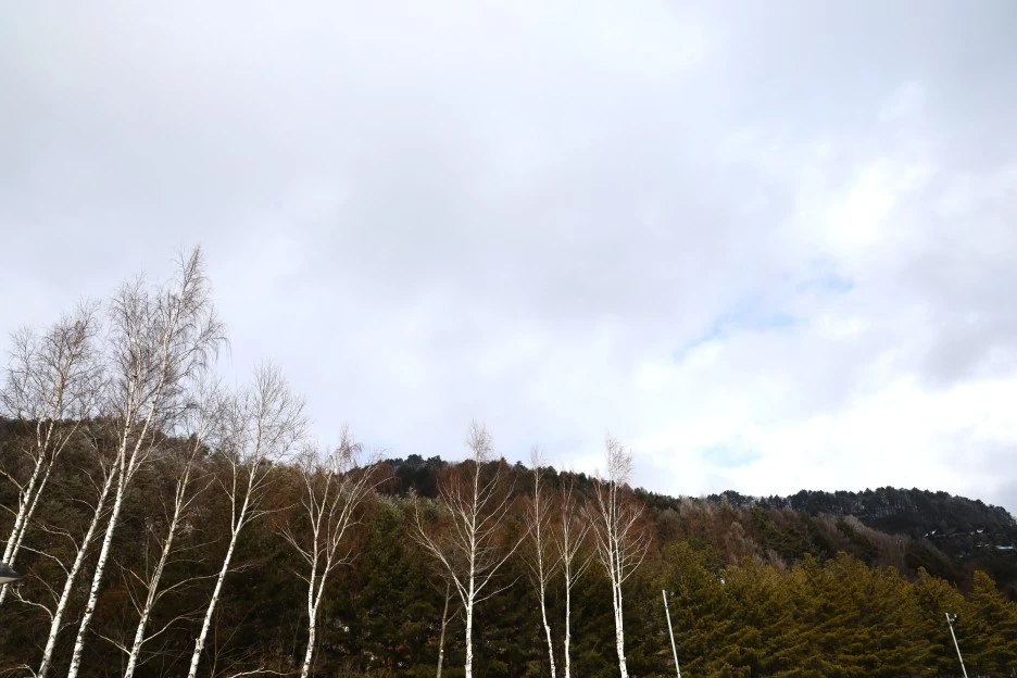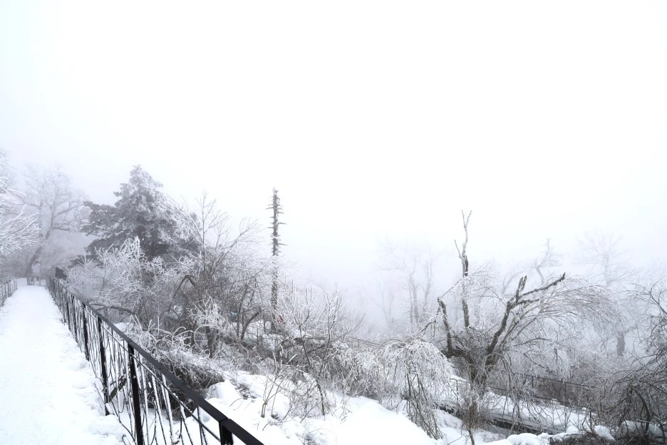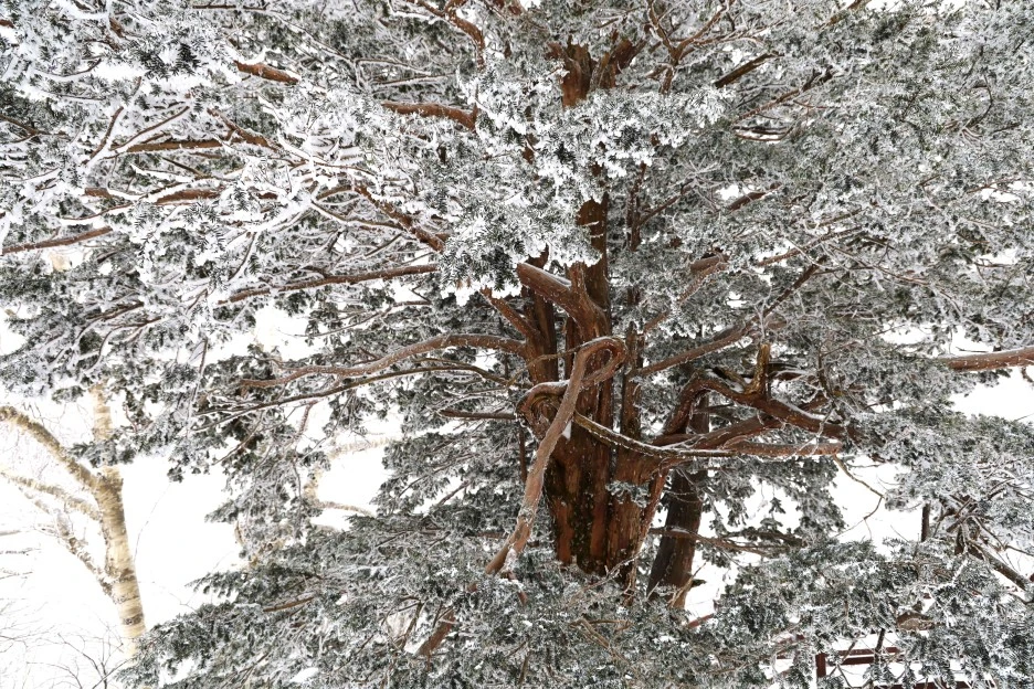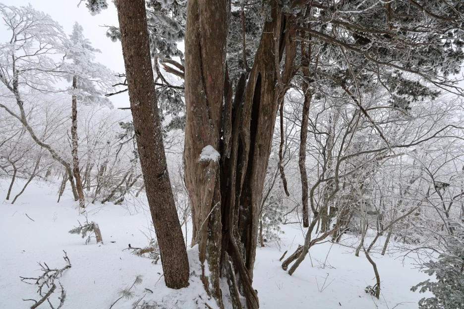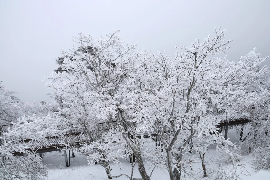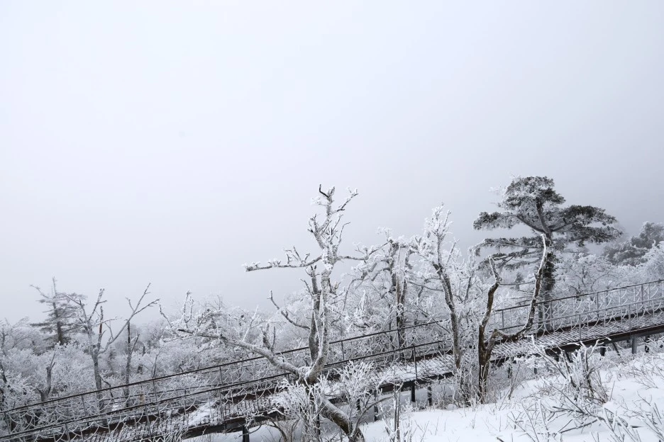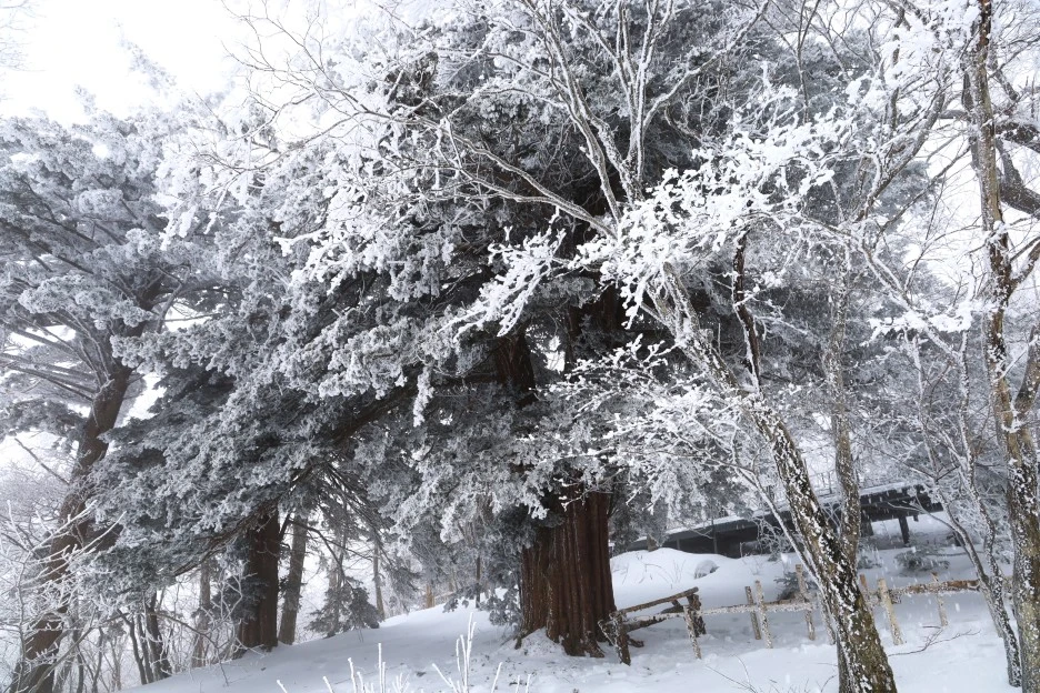 바로 앞의 하얀 숲 뒤에는 안개 속이다. 아래에서 보면 구름 속일까. 구름 속의 신선처럼 설국을 걸어볼까나.