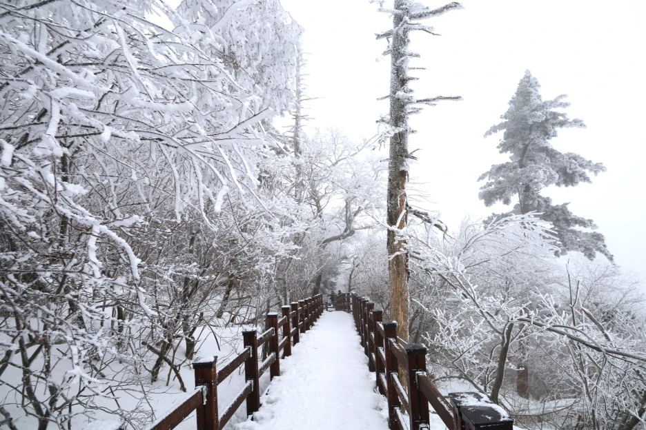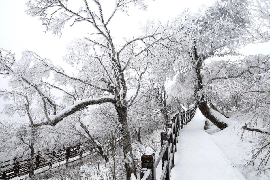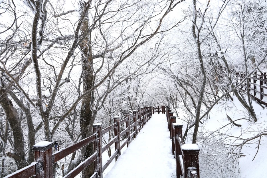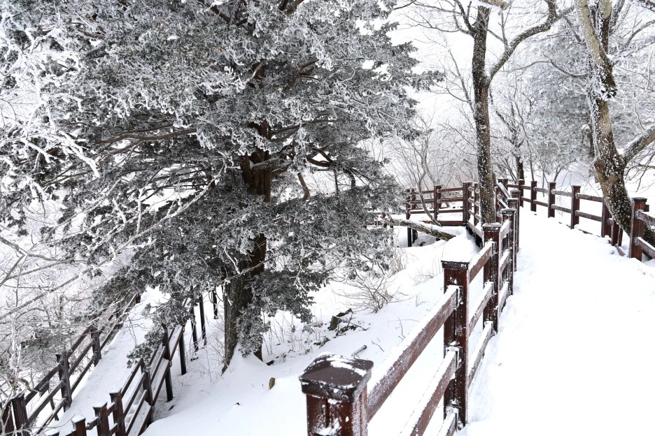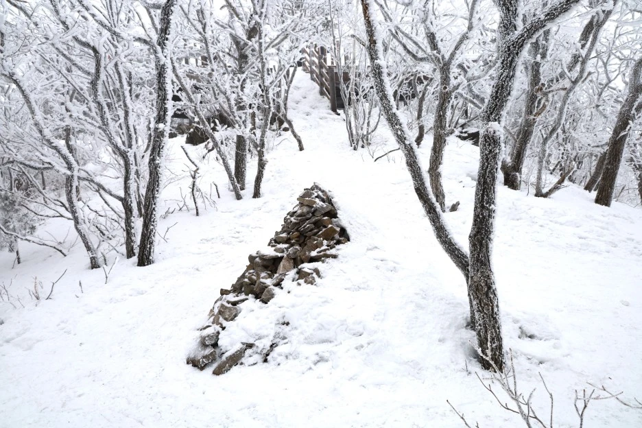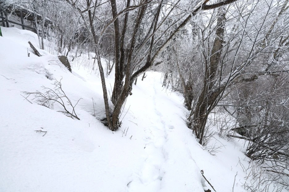그러나 그것도 잠시 곧 데크길은 아직도 20cm가 넘는 두께의 눈에 파묻혀 원래 데크길임을 알 수 없게 만든다.