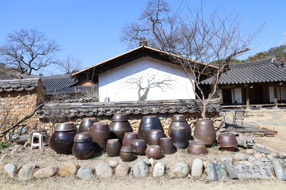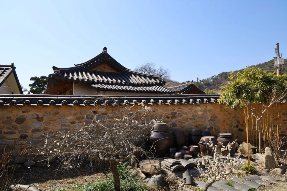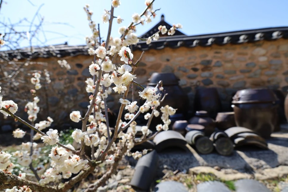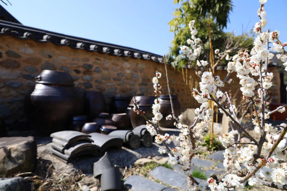 매화, 장독, 돌담의 멋진 어울림.