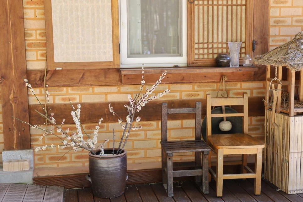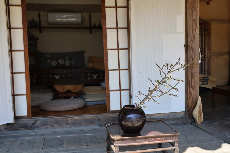 매화 가지는 항아리에 꽂아야 어울린다. 창호지 문살과 방안의 세간살이와 함께 한 폭의 그림이다.