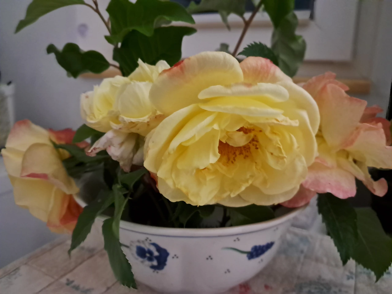 이사 올 때 수반은 버리고 침봉만 가지고 왔다. 꽃병은 있는데, 장미를 짧게 잘라서 면기를 가져다가 우선 꽂아놓았다. 예쁜 수반을 한 두 개 사놓아야겠다.